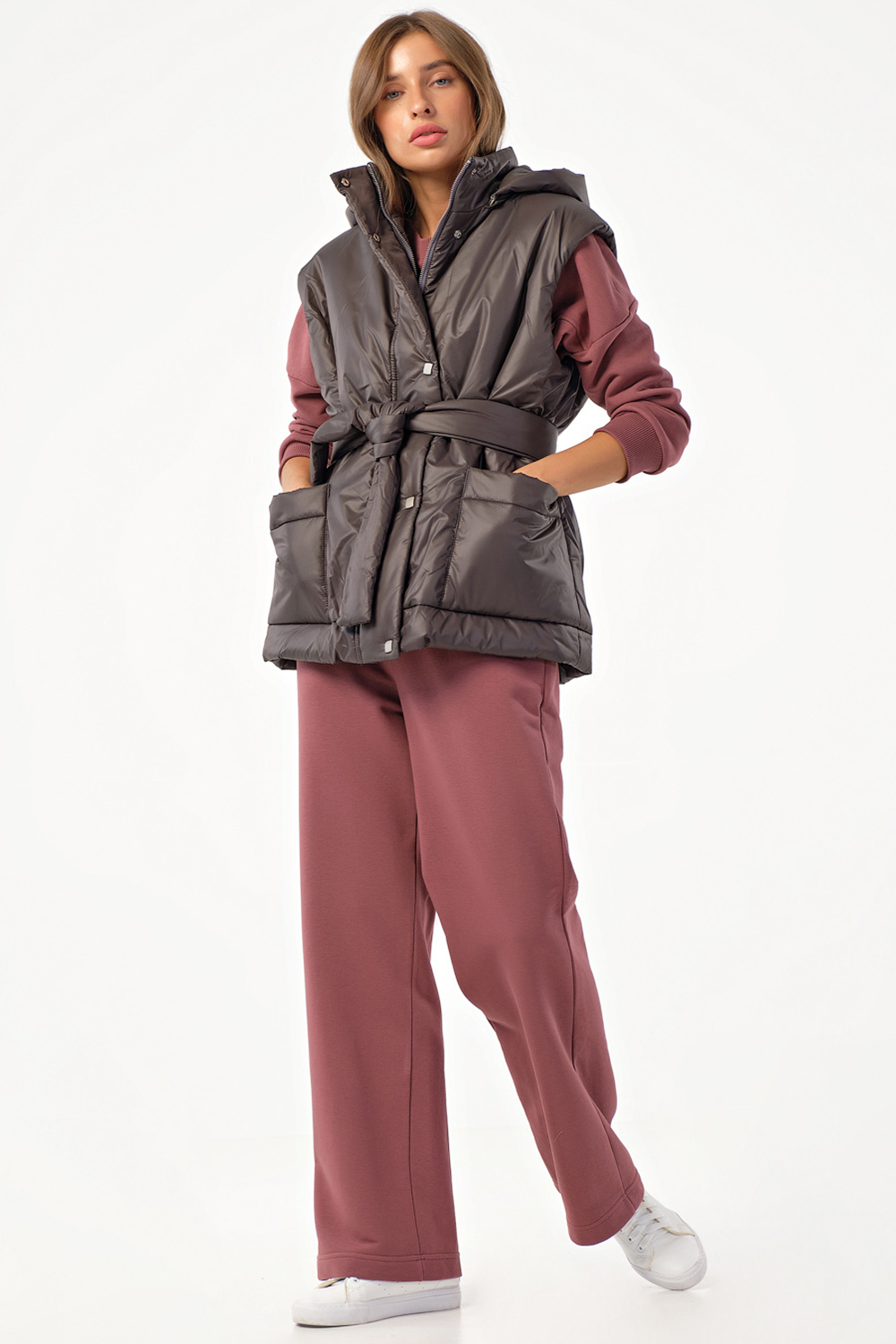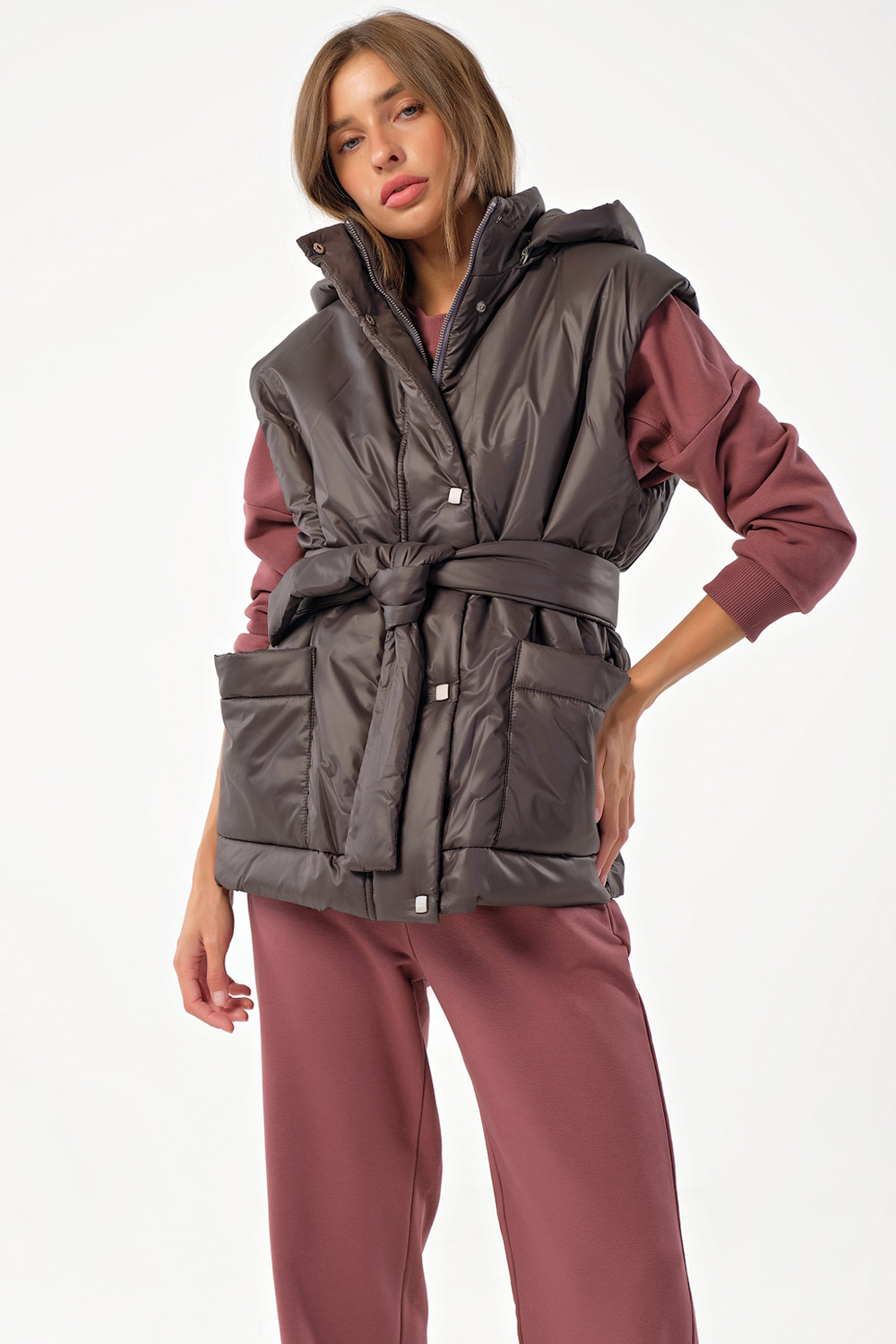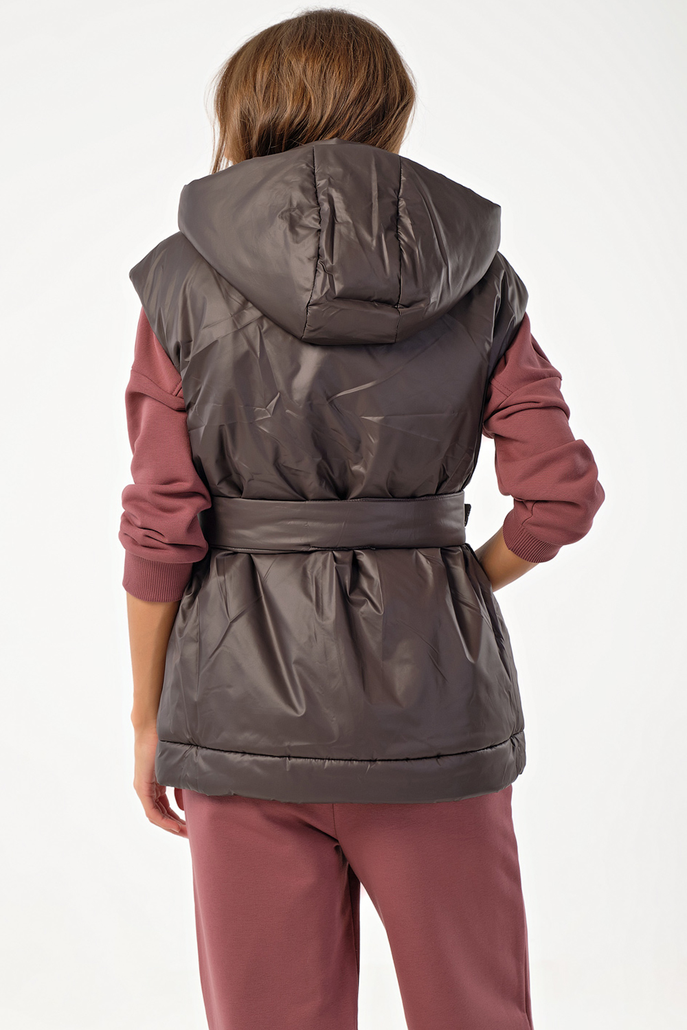 Жилет утепленный оверсайз на молнии с капюшоном коричневый