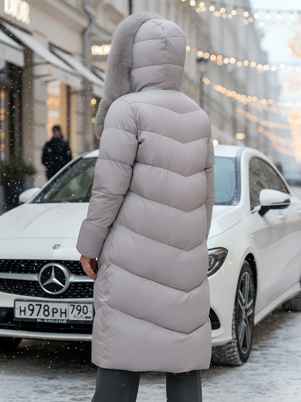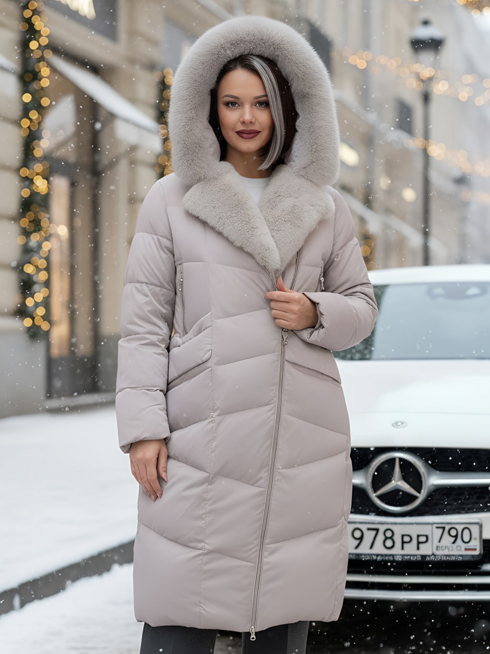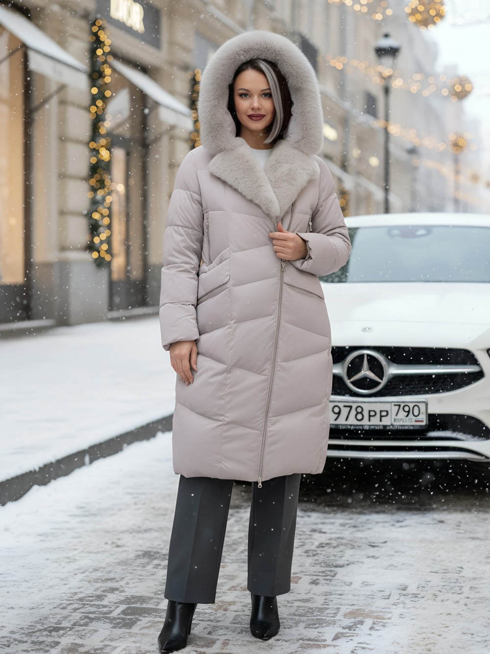 Изысканный английский воротник из натурального меха кролика и роскошная съемная опушка из песца создают неповторимый силуэт. Удлиненный крой ниже колена подчеркивает элегантность линий. Премиальный утеплитель повышенной плотности (640-740 г) обеспечивает максимальную защиту от холода.