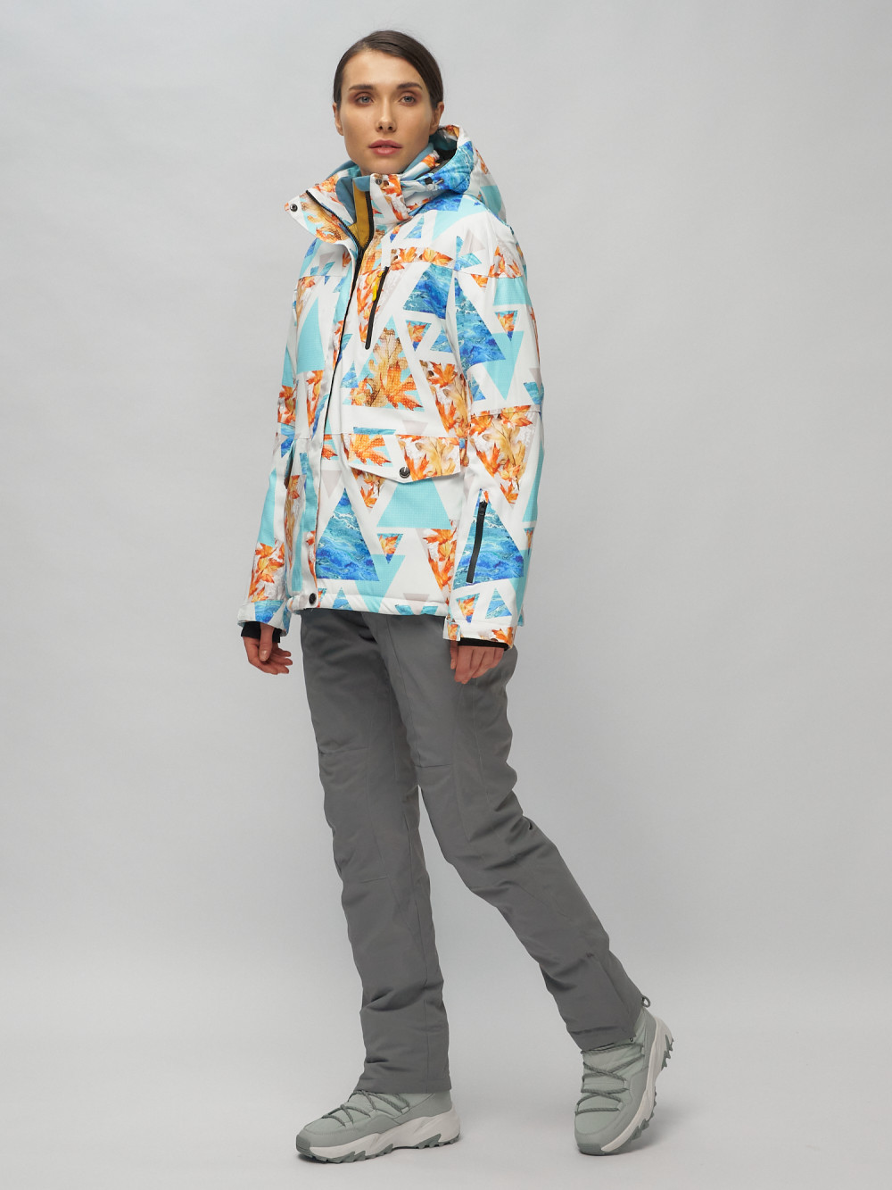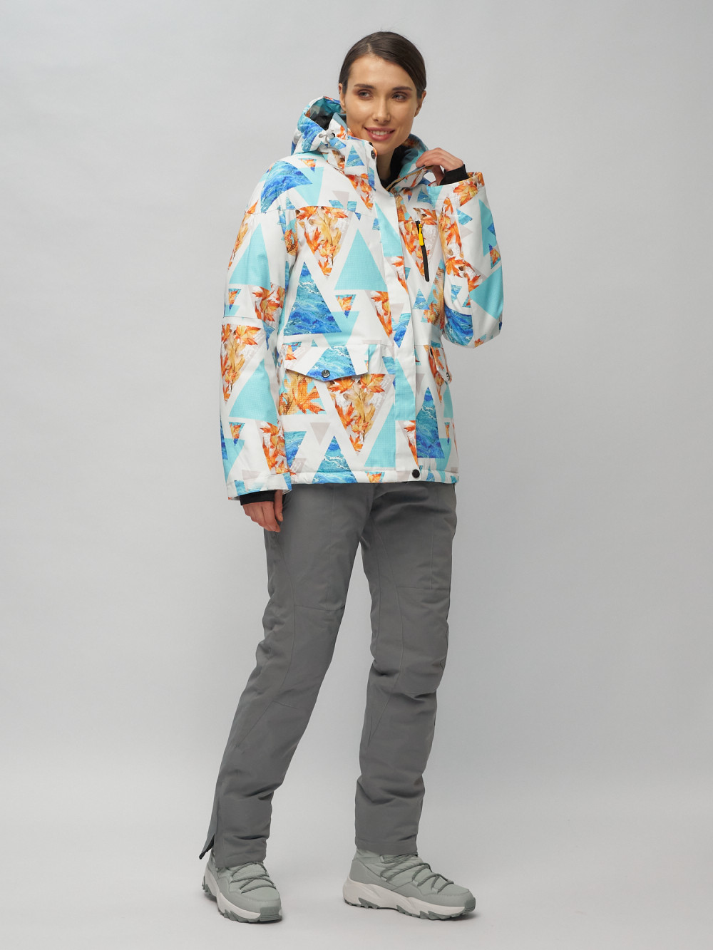 Женский зимний комплект верхней одежды состоит из горнолыжных брюк с бретелями и привлекательной, полуприталенной куртки с печатным геометрическим принтом. Полукомбинезон женский зимний имеет съемные бретели и спинку, снегозащитные гамаши с эластичной полосой - внутри штанины, расширитель штанин на молнии, застежку крючок, кнопку и молнию, боковые карманы на прорезиненной молнии (водоотталкивающая). Внимание! Бретели полукомбинезона в заказе могут отличаться цветом и принтом.