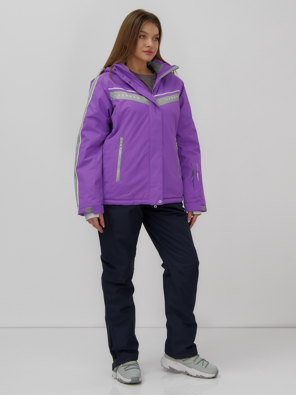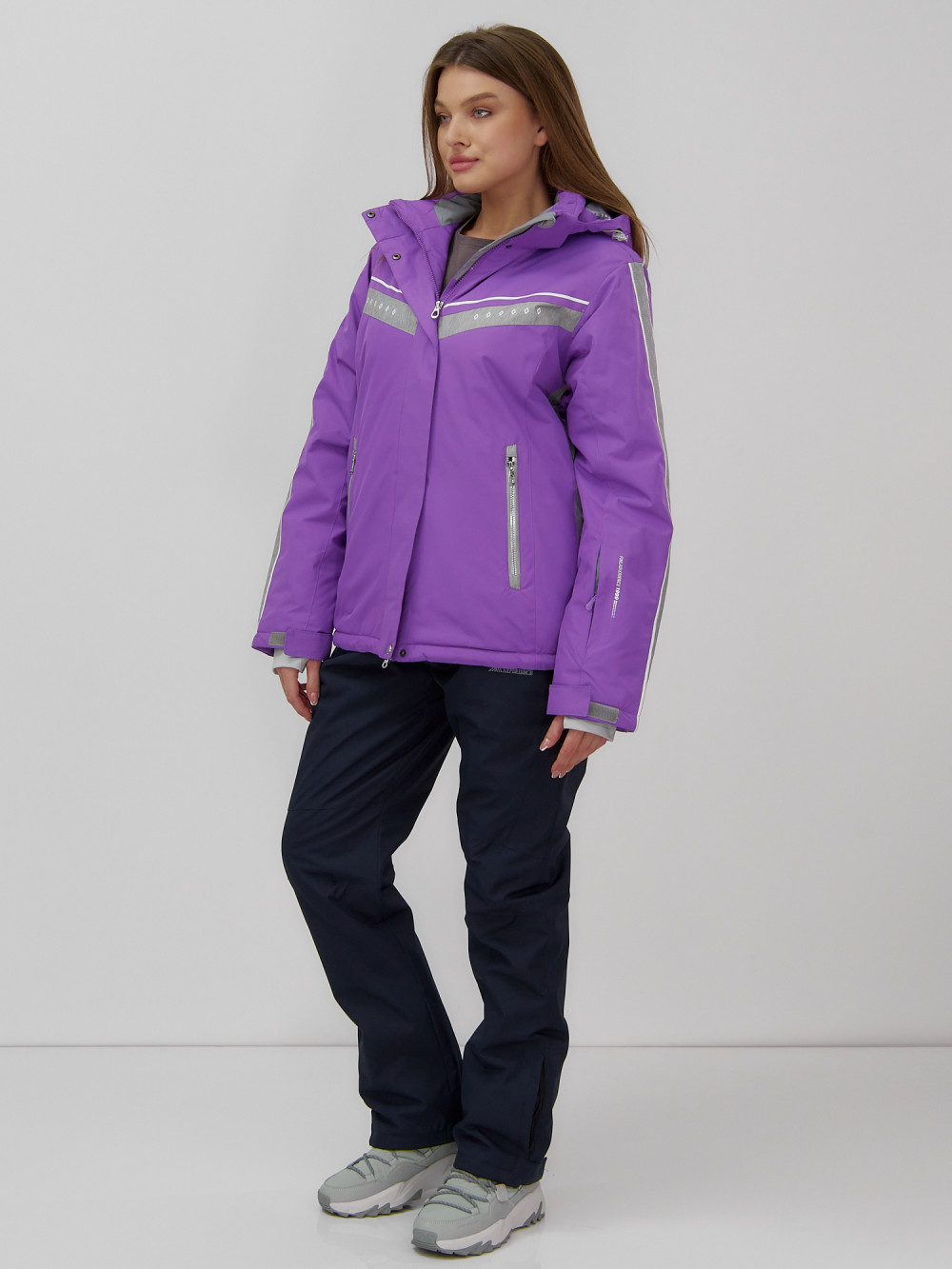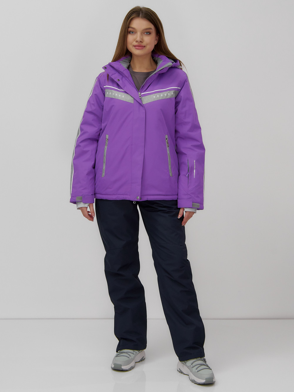 Однотонная куртка с контрастными вставками на рукавах и груди выглядит оригинально и стильно, что делает этот комплект не только практичным, но и модным выбором для зимнего отдыха.