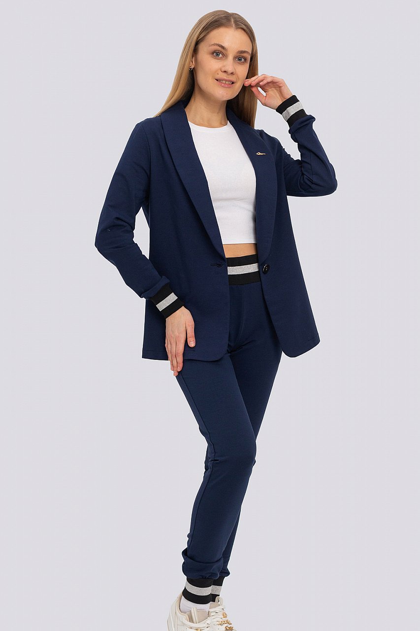 темно-синий Забудьте об элегантных и отполированных луках, ведь на замену такому идеальному стилю пришло небрежное сочетание практичных, и на первый взгляд, несовместимых вещей из спортивного и классического стилей. Этот универсальный трикотажный костюм-идеальный вариант в качестве стильной и комфортной одежды на каждый день. Состав трикотажа: 75% хлопок, 20% полиэстер, 5% спандекс.