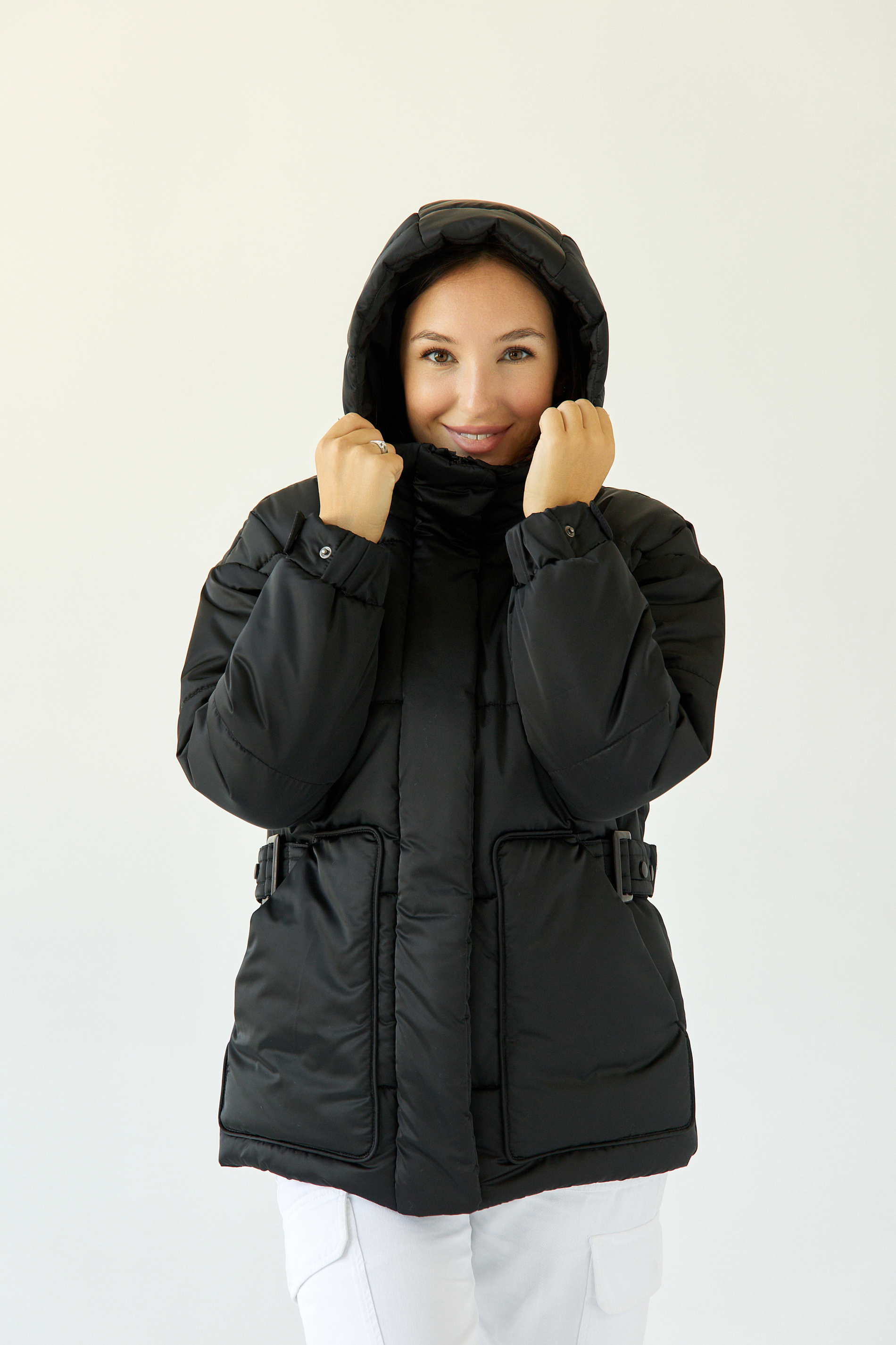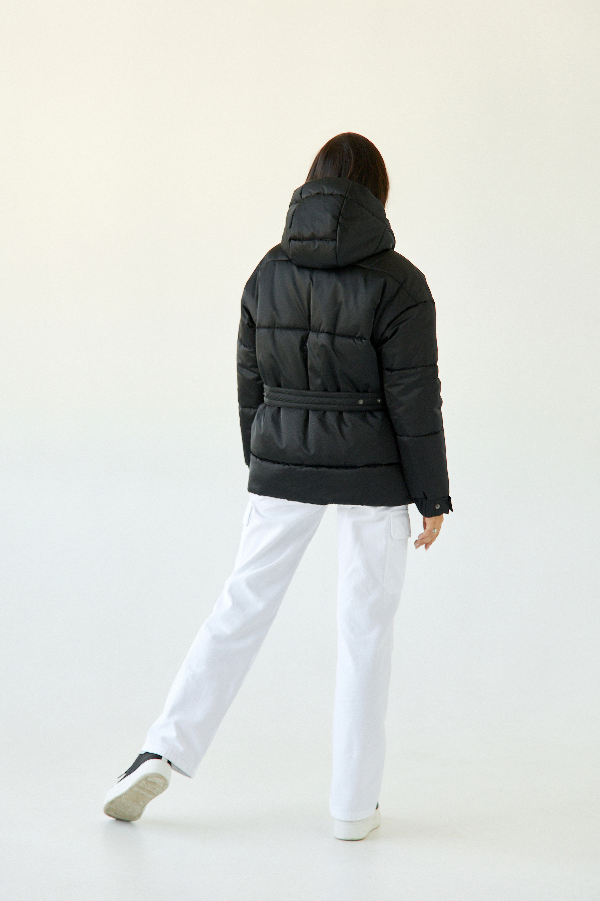 Пояс передний с пряжкой, выходит из-под кармана. Пояс спинки на кнопках регулирует объем талии.