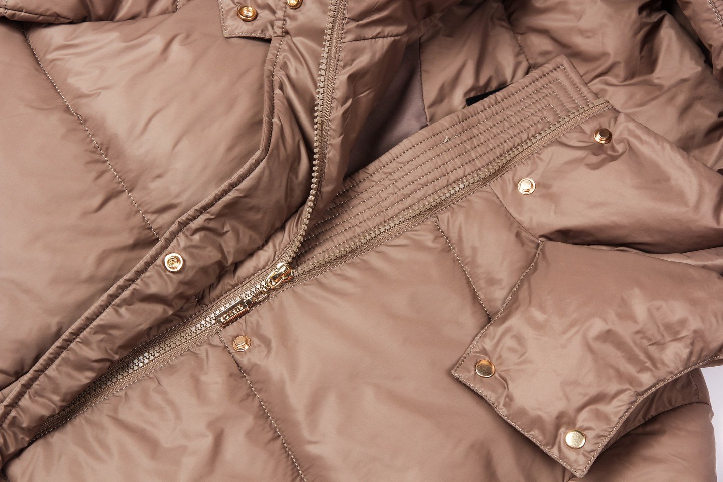 позволяет выглядеть дорого, со вкусом. Утеплитель синтепух, температурный режим – до -20. бежевый хаки