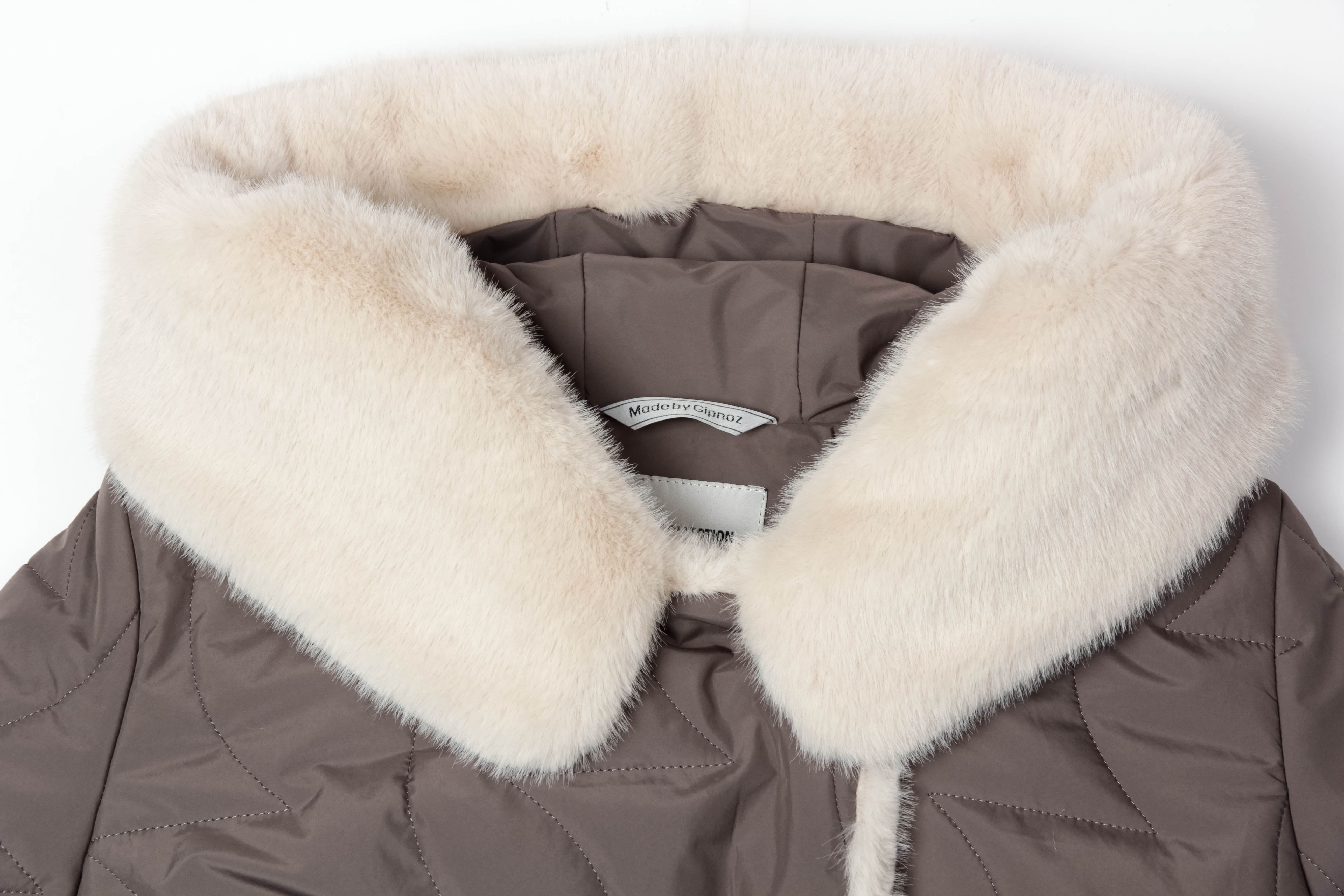 Впервые в зимнем сезоне мы предлагаем пальто из стеганой ткани. Изделие из данной ткани более практичное и удобное в использовании. Пальто в классическом стиле, полуприлегающего силуэта. Умеренный объем изделия идеально подходит для создания уютного образа, который при этом будет выглядеть стильно и элегантно. Втачной покрой рукава идеален для любой фигуры, придает стройность и строгость образу. Капюшон - защитит от холода, а нежнейший мех, имитирующий норку, красиво ложится вокруг лица. Рукав отгибается на манжет. Модель отлично смотрится с поясом и без. Пальто застегивается на пуговицы и внутреннюю молнию. Новый вид стежки несомненно приковывает взгляды окружающих. Нам удалось продлить сезон носки изделия, за счет внедрения в производство нового вида стеганой ткани. Ткань верха плотная и многослойная. Утеплитель термофин, плотность 260. Температурный режим до -25. серо-коричневый