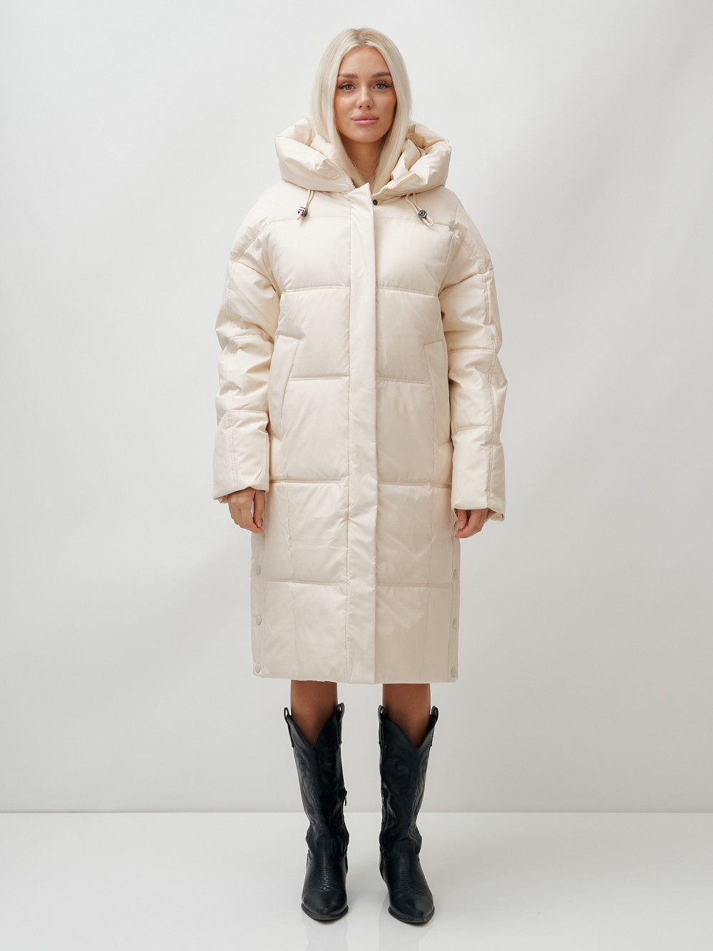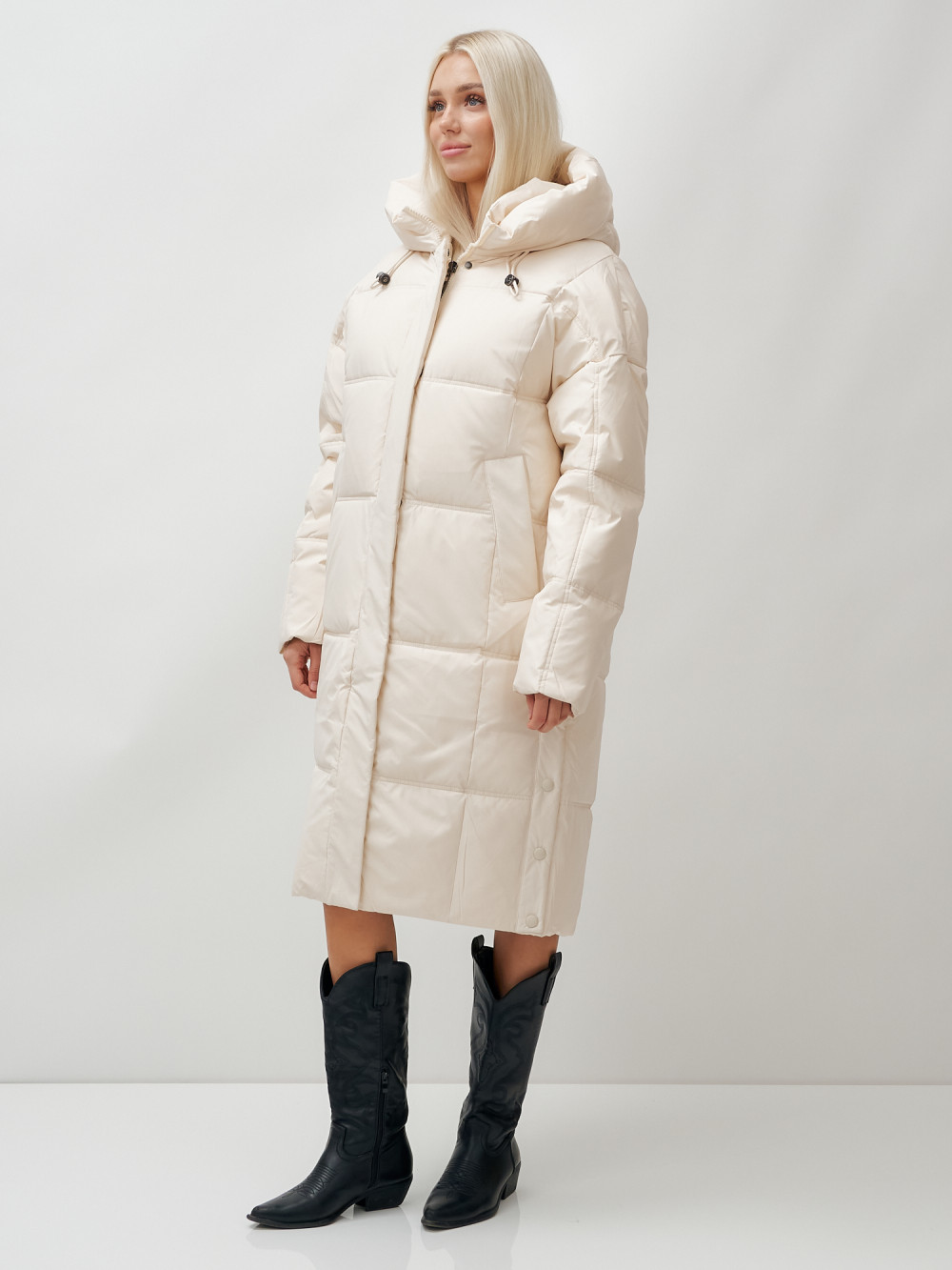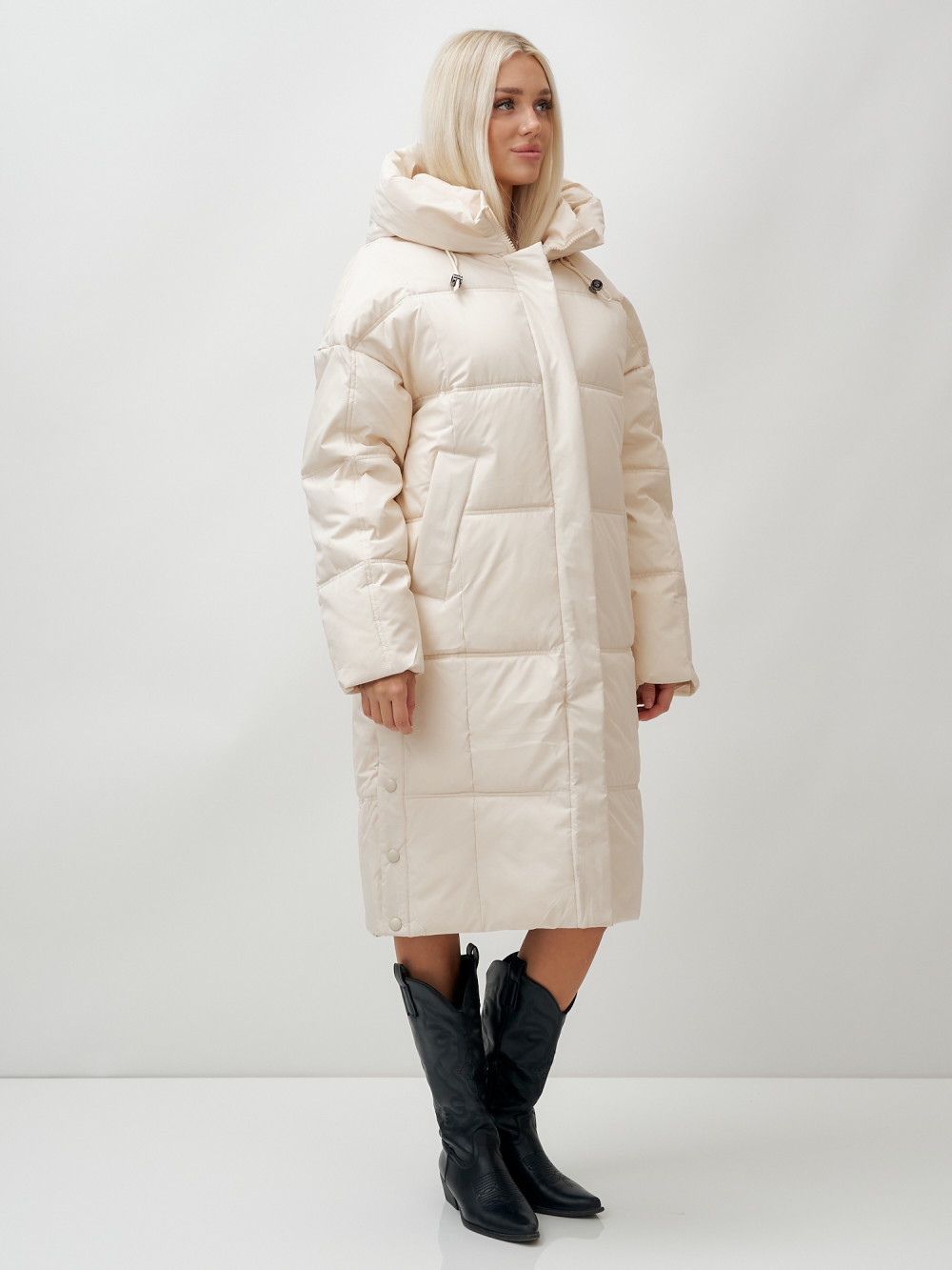 Пальто летучая мышь женское с капюшоном зимнее бежевого цвета 9619B