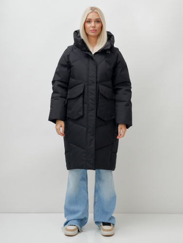 Пальто летучая мышь женское с капюшоном зимнее черного цвета 9618Ch