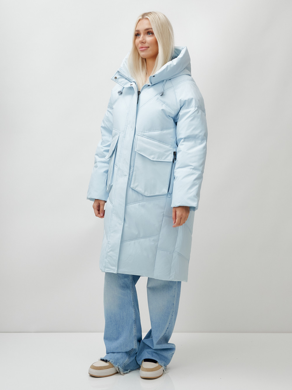 Пальто летучая мышь женское с капюшоном зимнее голубого цвета 9618Gl