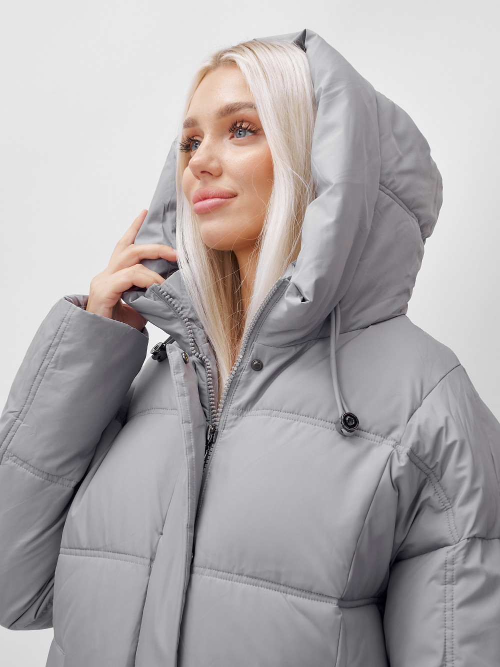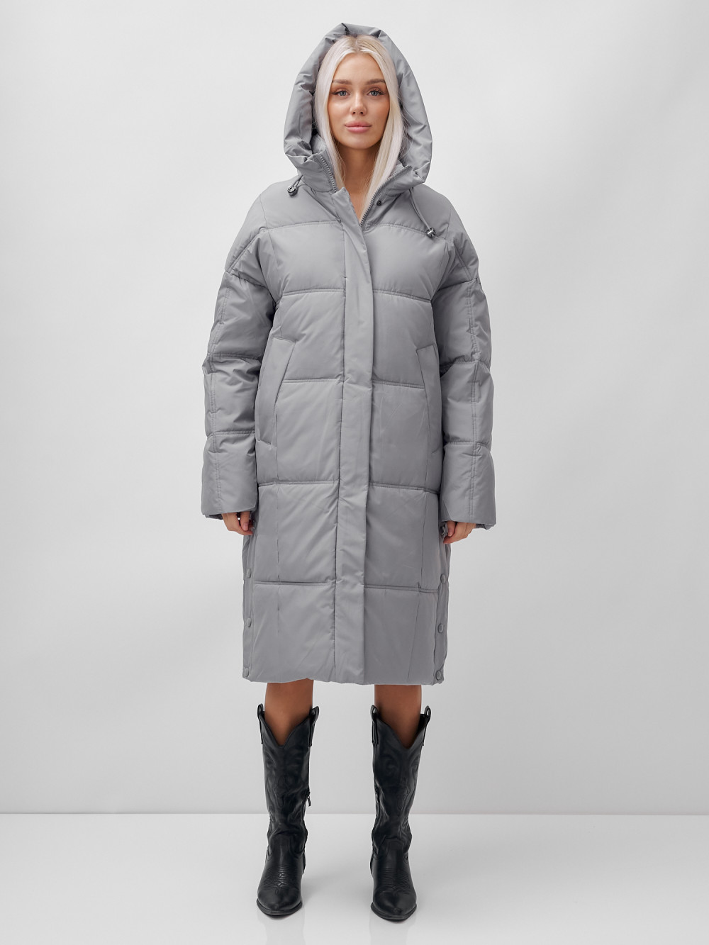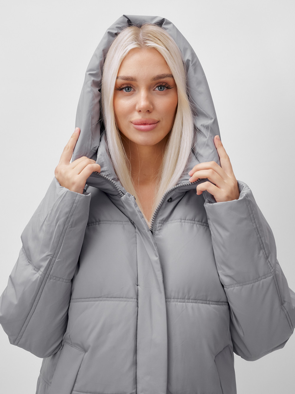 Пальто летучая мышь женское с капюшоном зимнее серого цвета 9619Sr