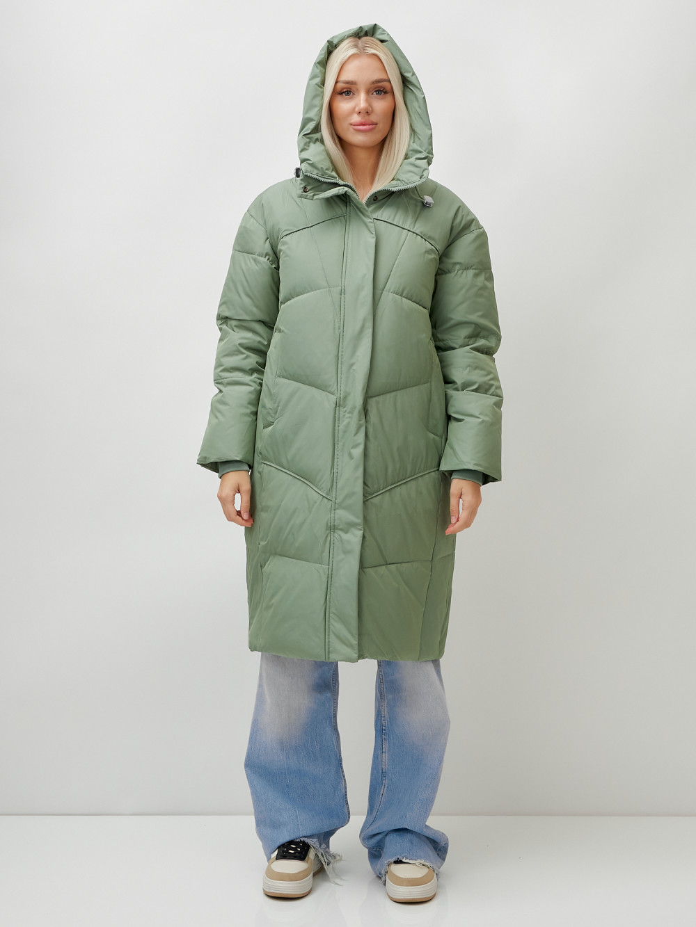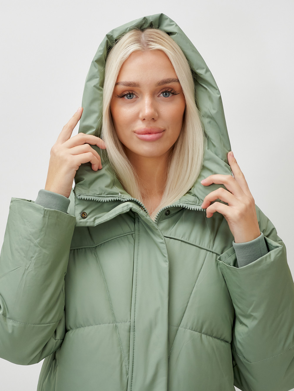 Пальто летучая мышь женское с капюшоном зимнее зеленого цвета 9616Z