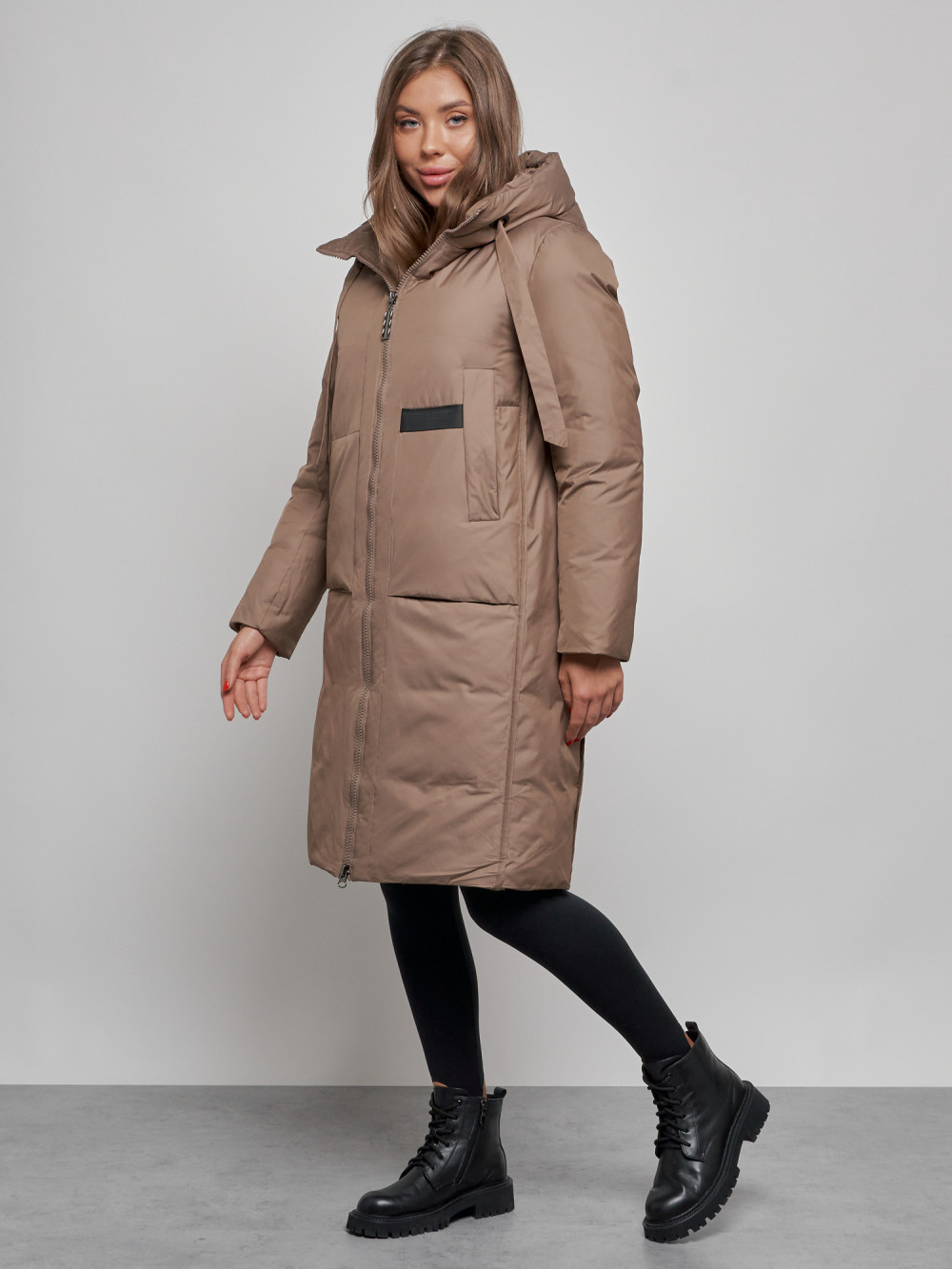 Пальто утепленное молодежное зимнее женское коричневого цвета 52359K
