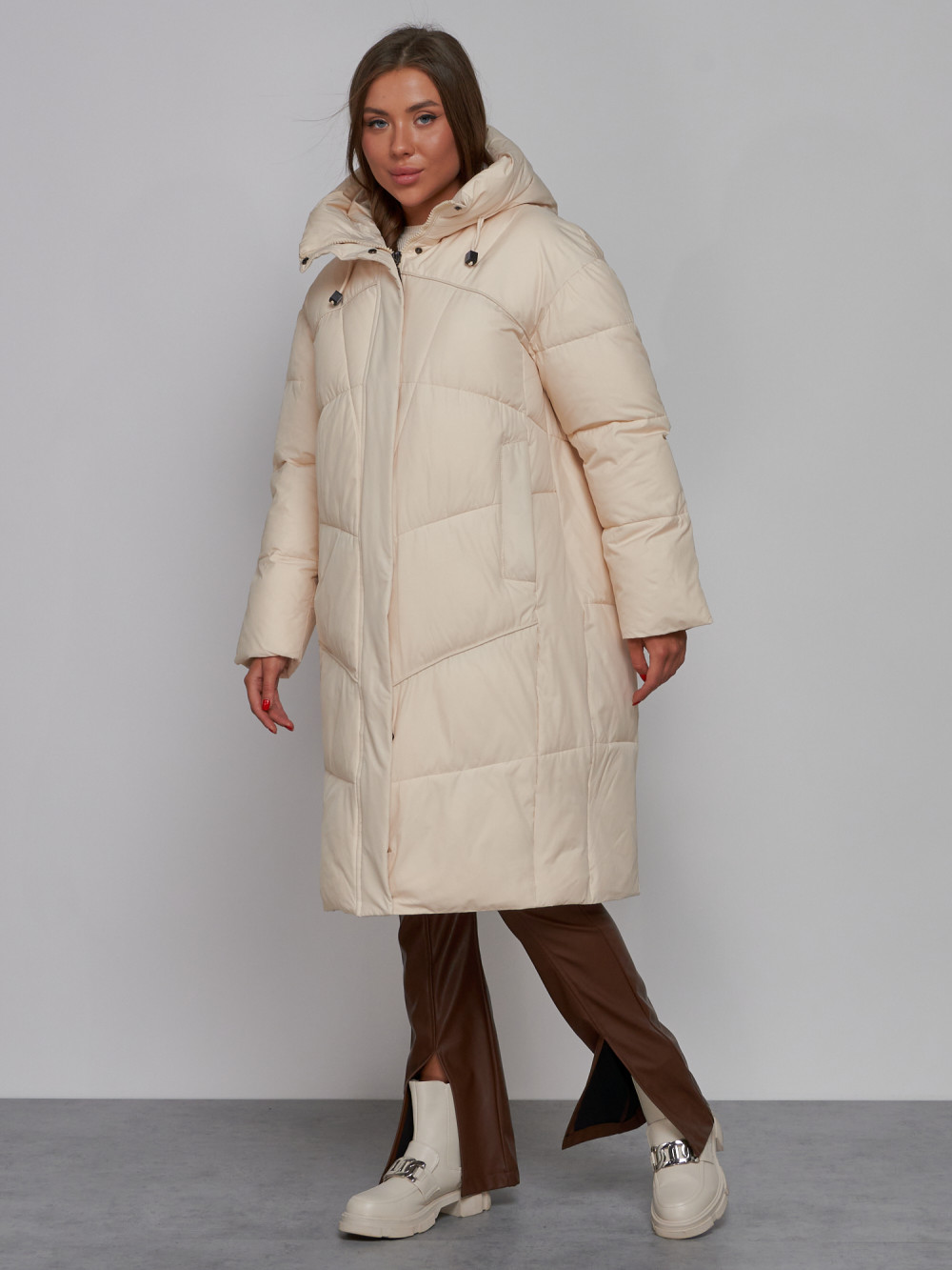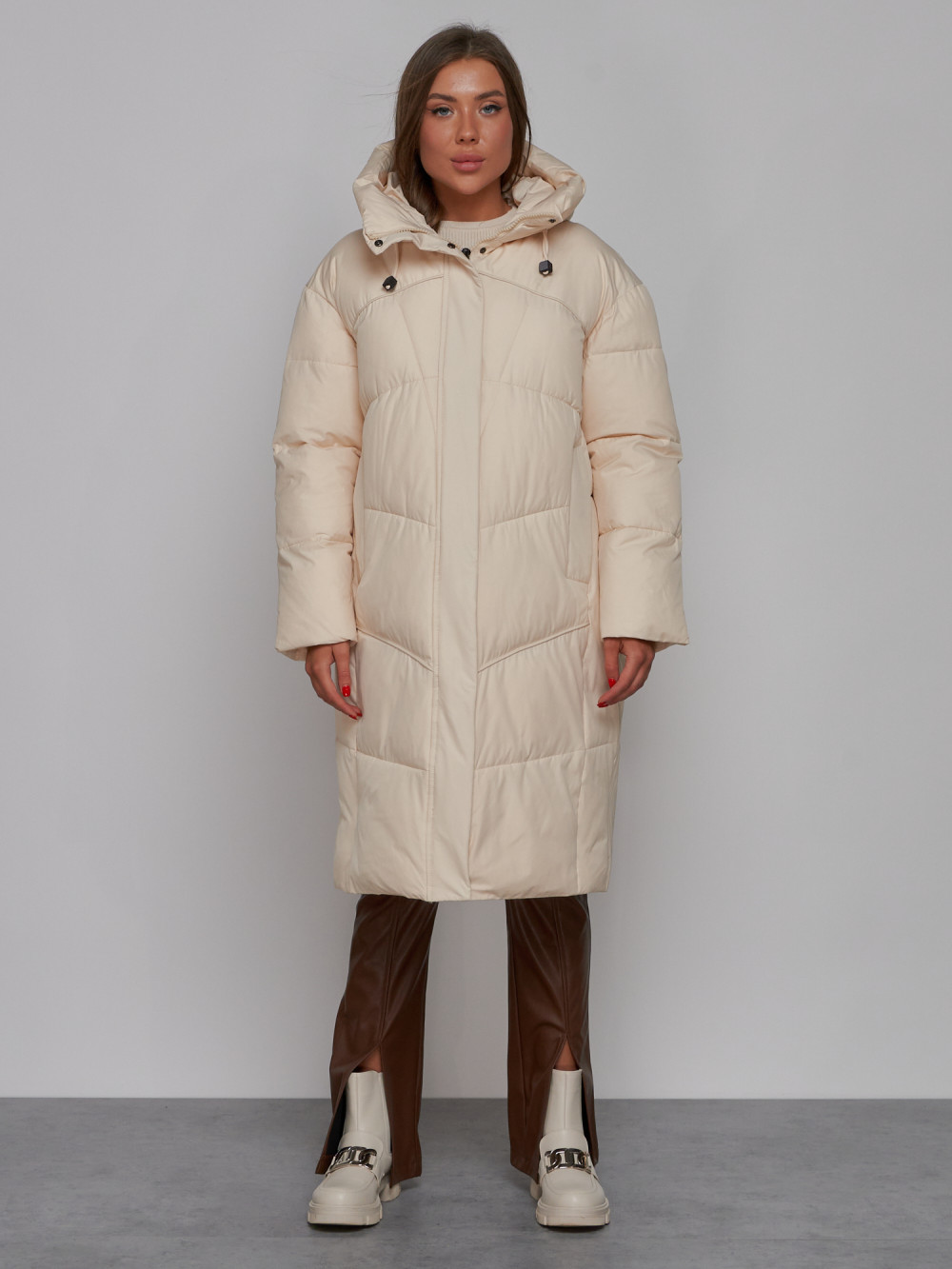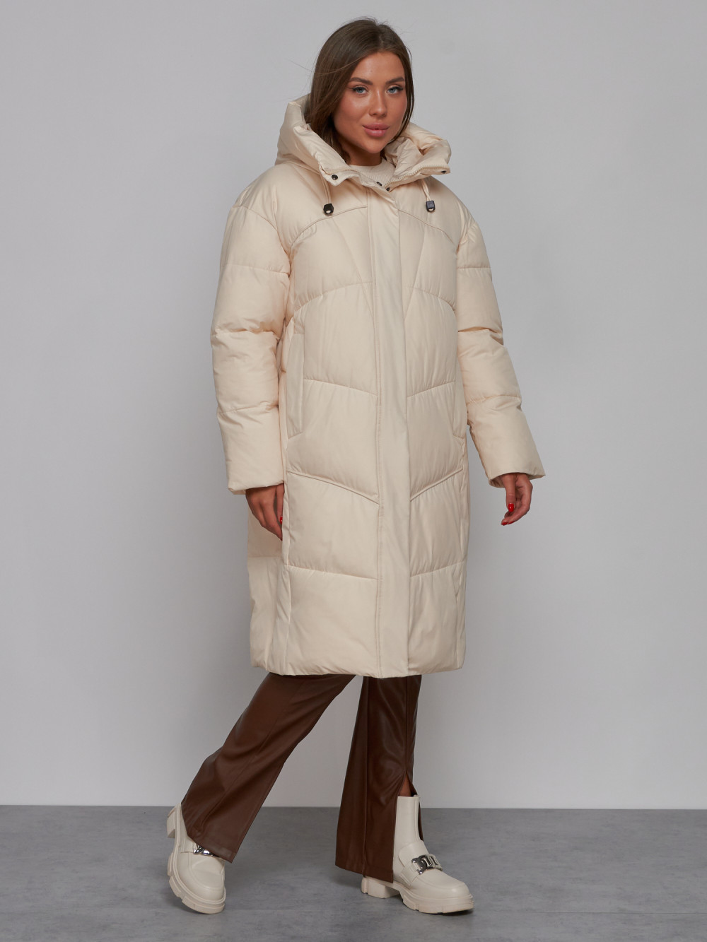 Пальто утепленное молодежное зимнее женское светло-бежевого цвета 52326SB
