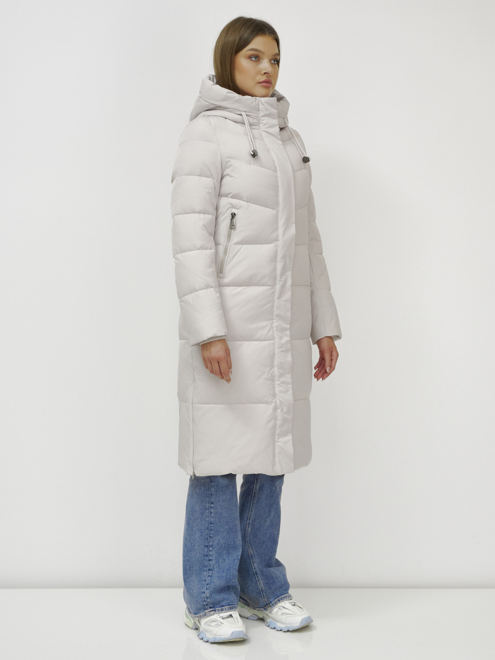 Пальто утепленное стеганное зимнее с капюшоном женское бежевого цвета 9636_1B