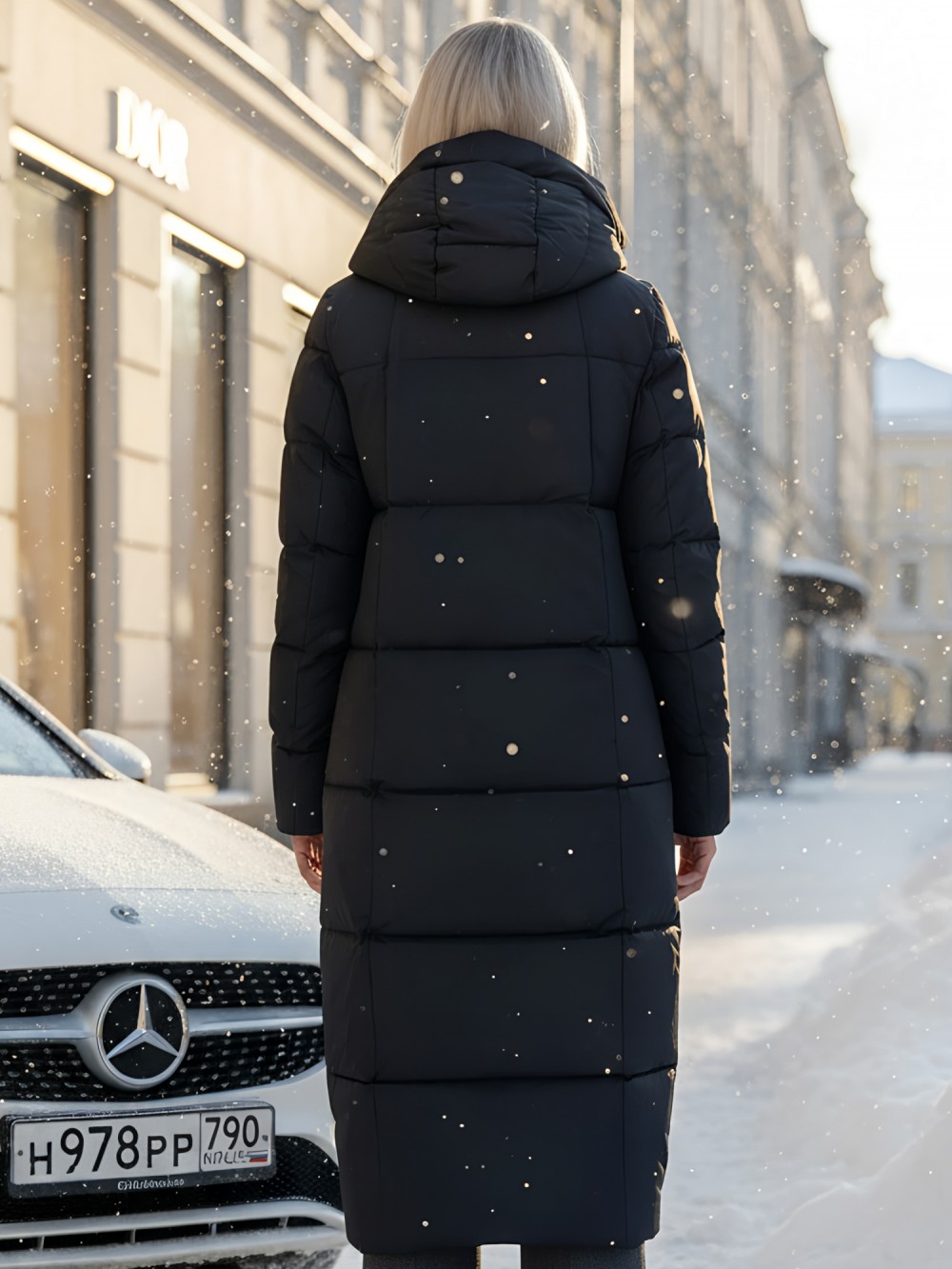 Зимнее женское утепленное пальто с капюшоном и идеальными деталями для вашего комфорта.