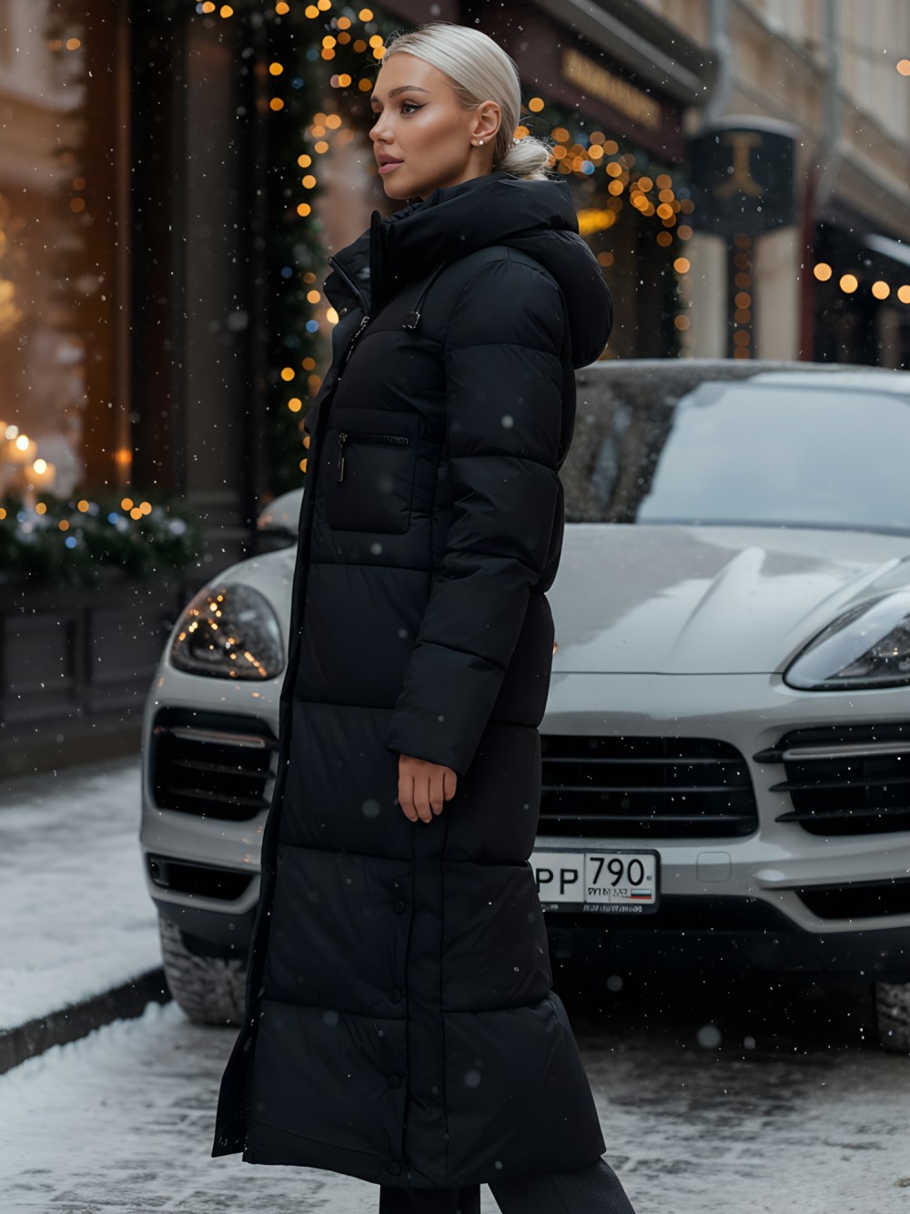 — Оно оснащено несъемным капюшоном, который защитит вас от ветра и снега, а прямые рукава с трикотажными манжетами плотно прилегают и сохраняют тепло внутри.
