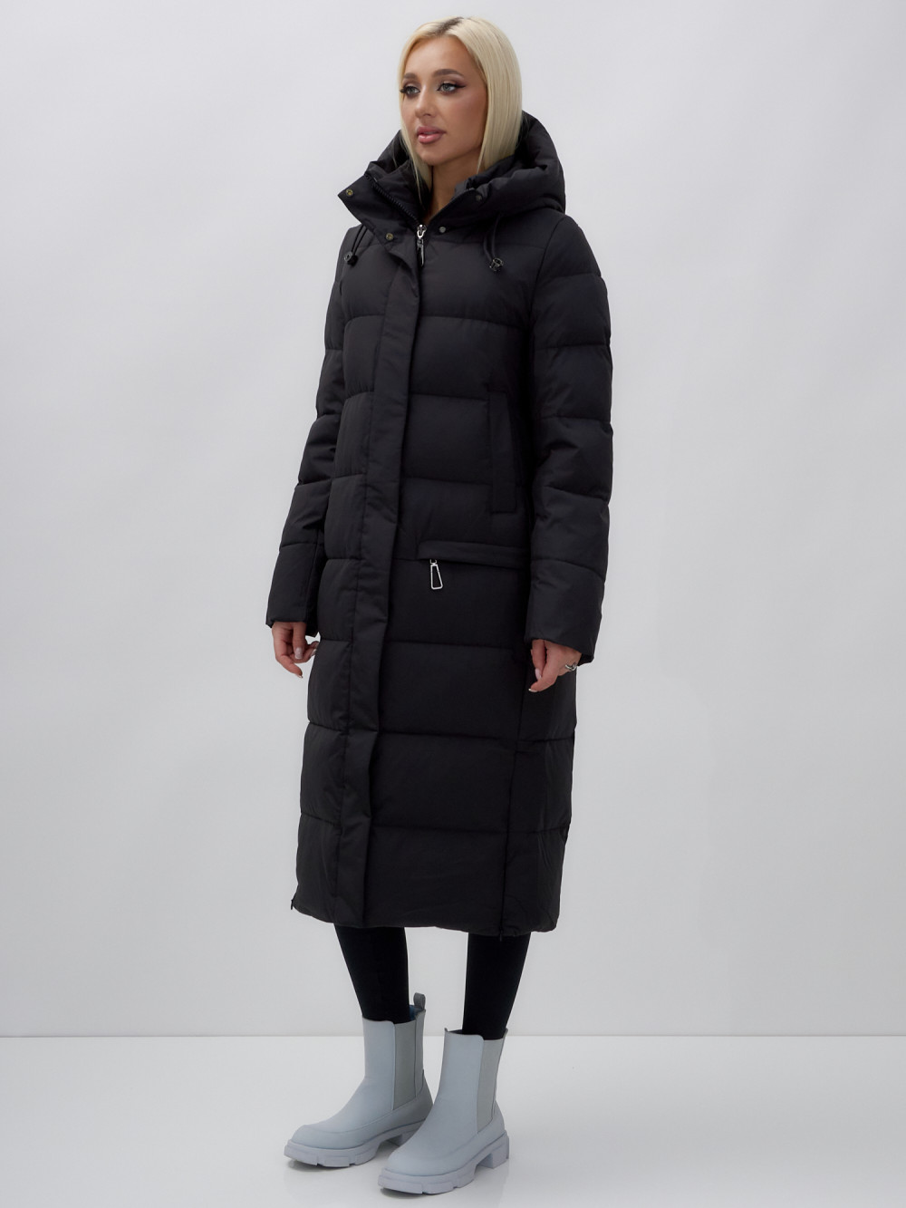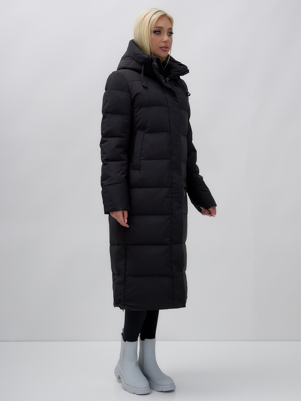 Пальто утепленное стеганное зимнее с капюшоном женское черного цвета 9626Ch