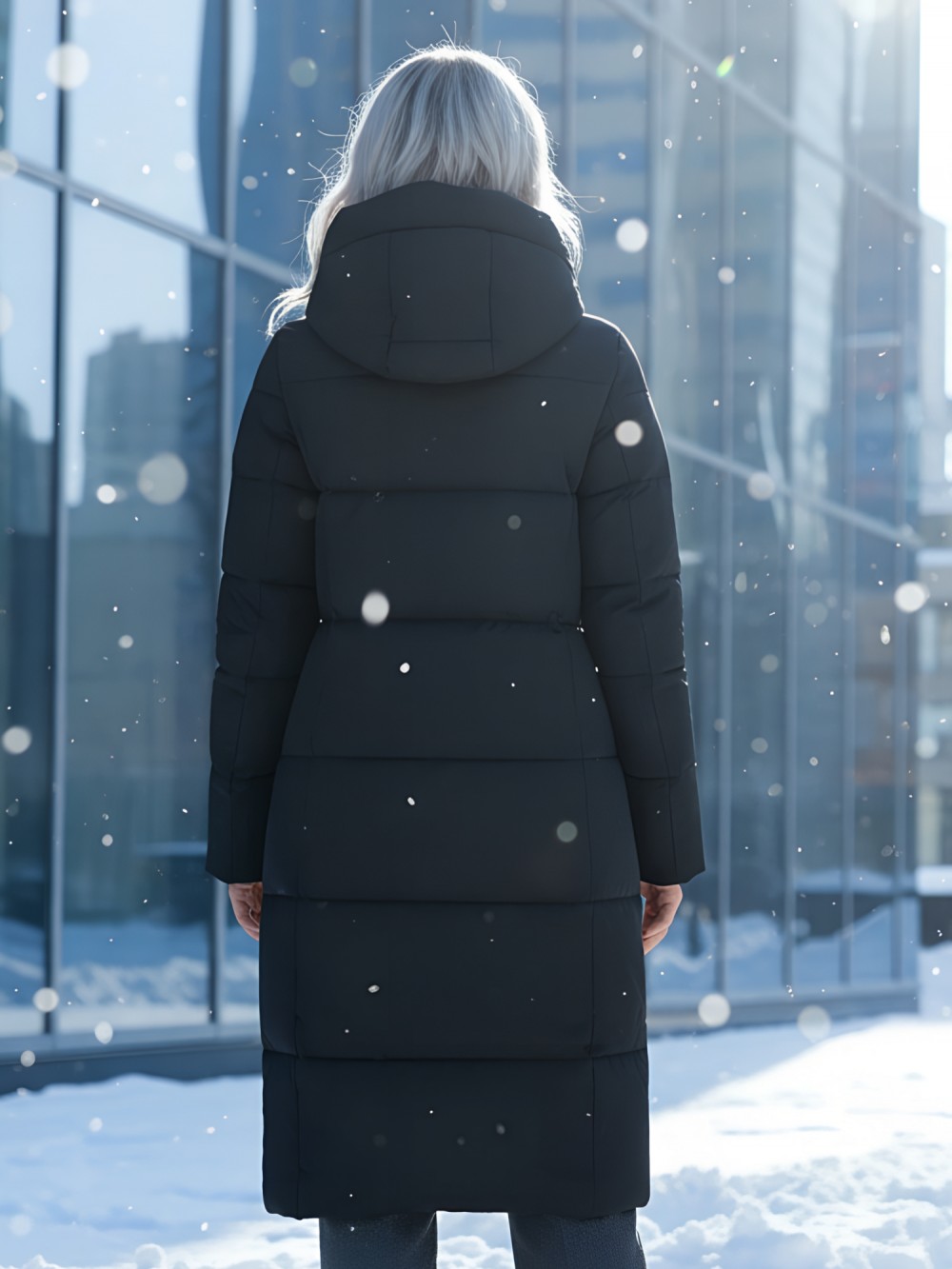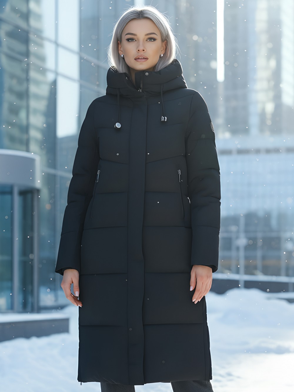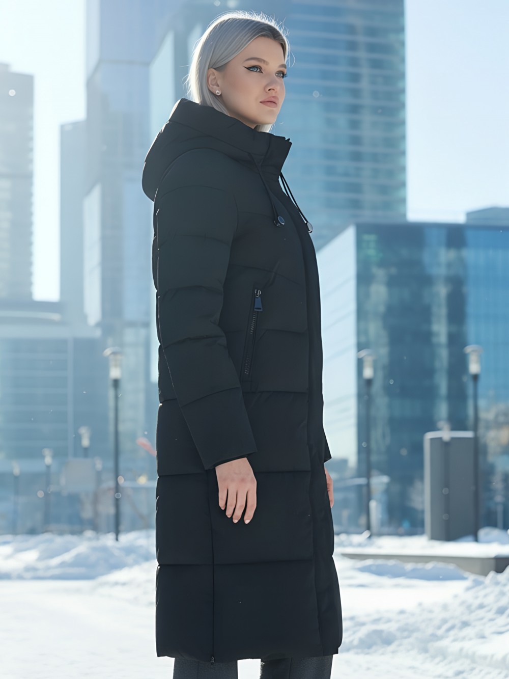 Эргономичный дизайн: Прямой крой ниже колена создает элегантный силуэт, а стеганая фактура добавляет изюминку. Несъемный капюшон с фиксаторами и ветрозащитная планка на кнопках защитят от пронизывающего ветра.