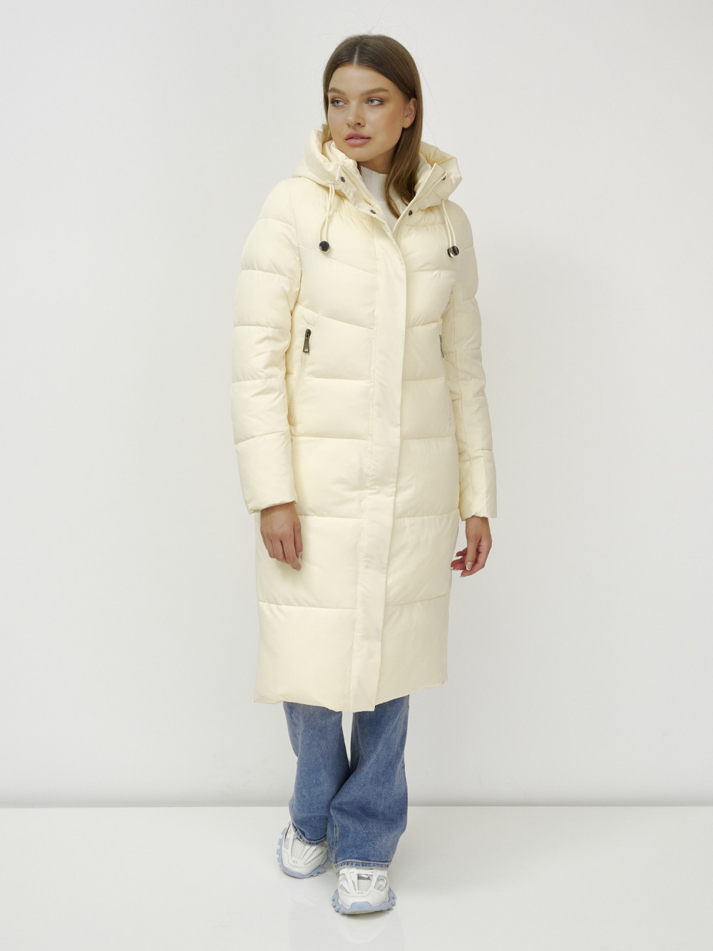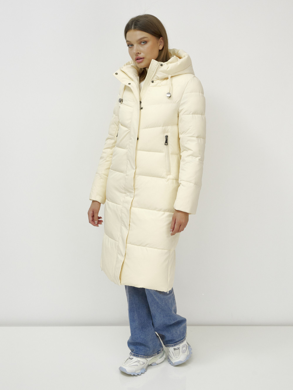 Пальто утепленное стеганное зимнее с капюшоном женское светло-бежевого цвета 9636_1SB