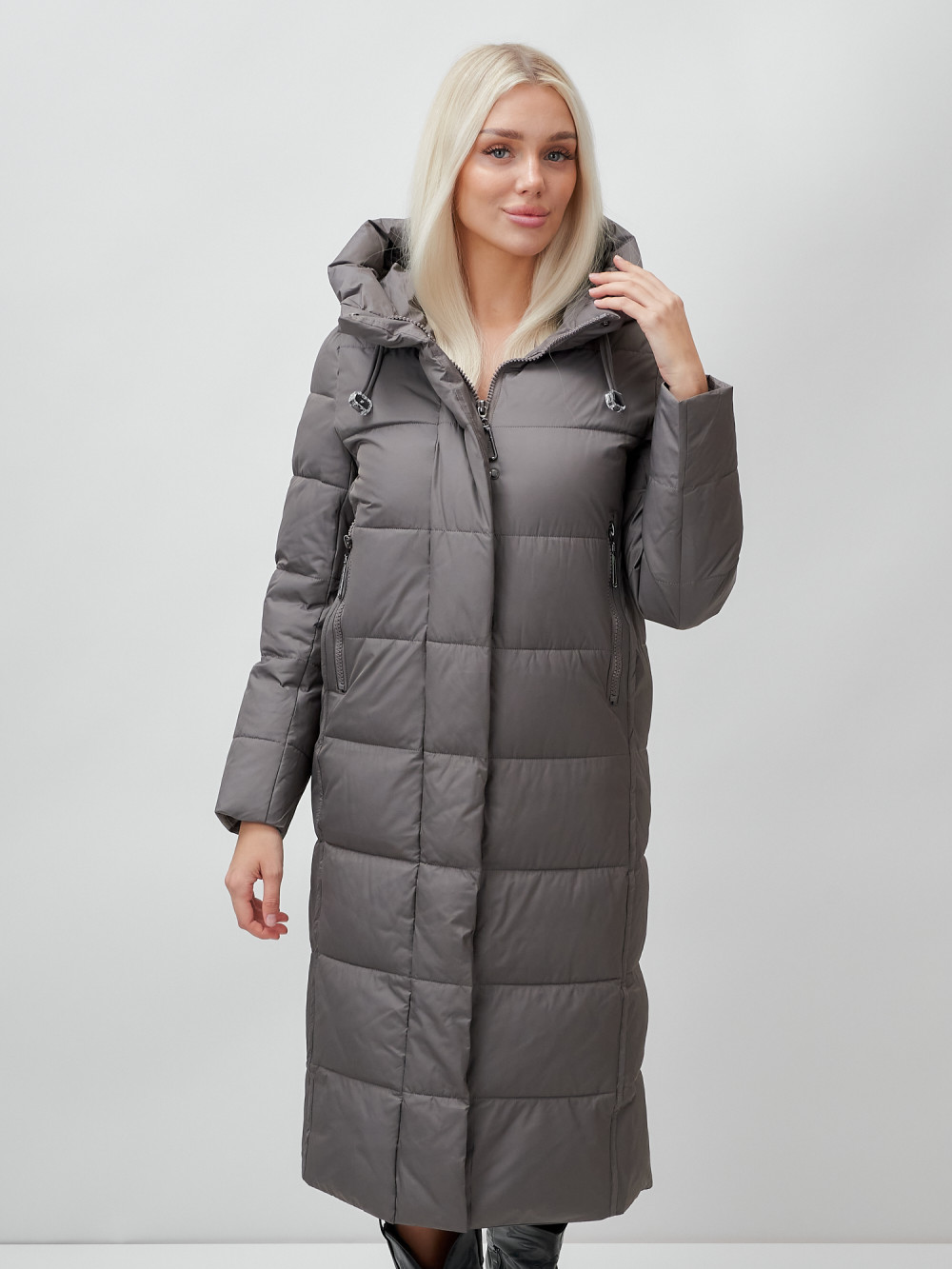 Пальто утепленное стеганное зимнее с капюшоном женское темно-серого цвета 9606TC