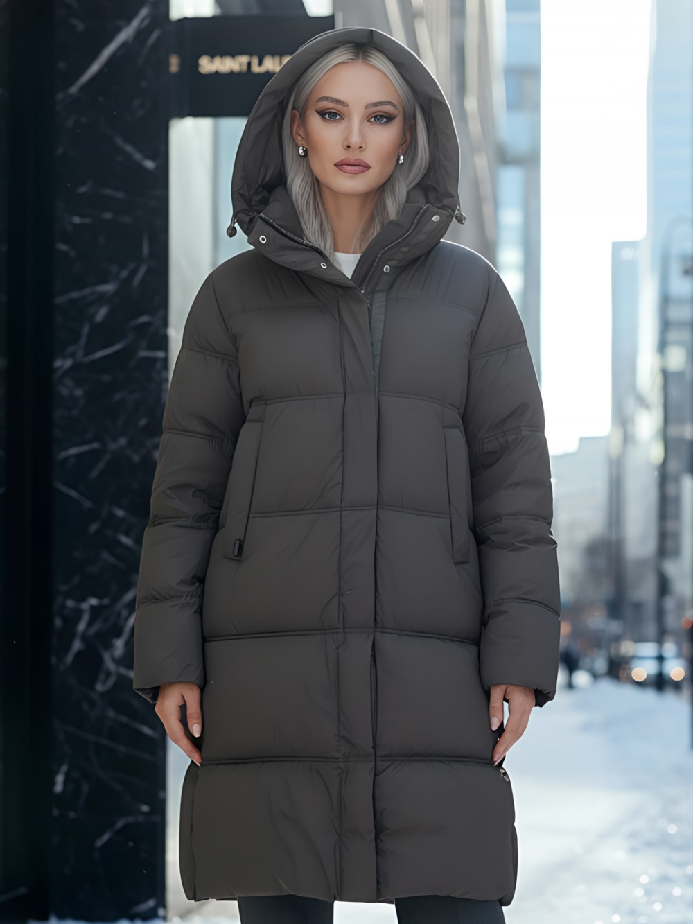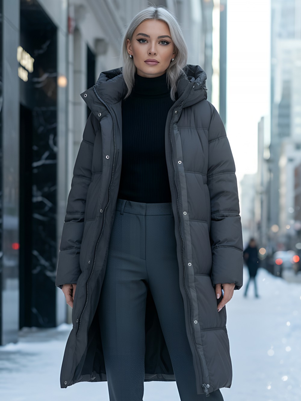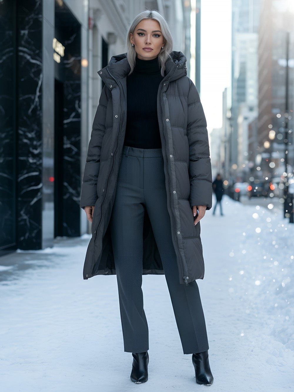 Элегантный покрой с удлиненной длиной до колена и стильным капюшоном с фиксатором придают этому пальто утонченный вид, что делает его идеальным вариантом как для офиса, так и для повседневной жизни. Внутренние карманы добавляют практичности, а двойная молния и кнопки с клапаном подчеркивают современный стиль.