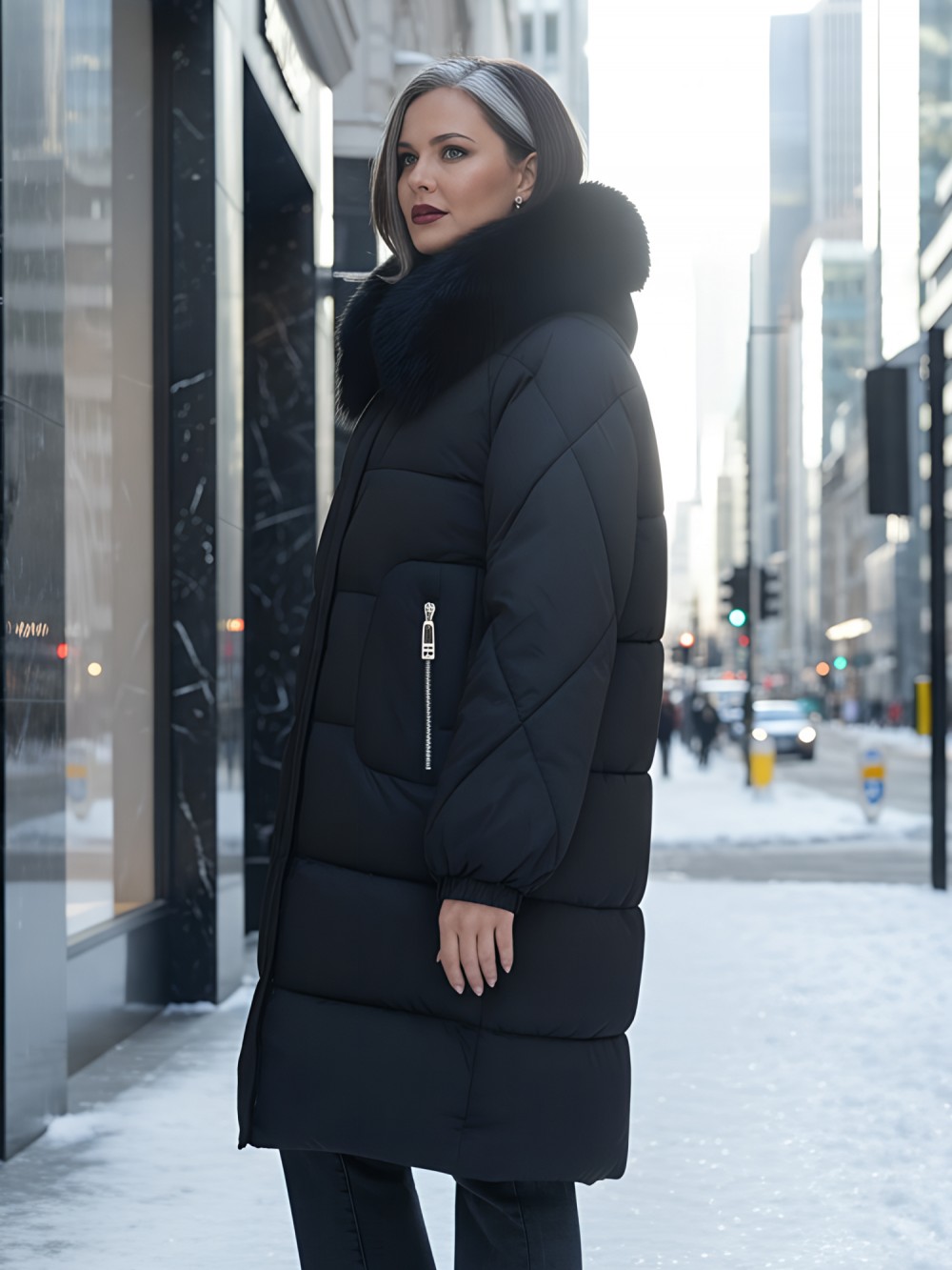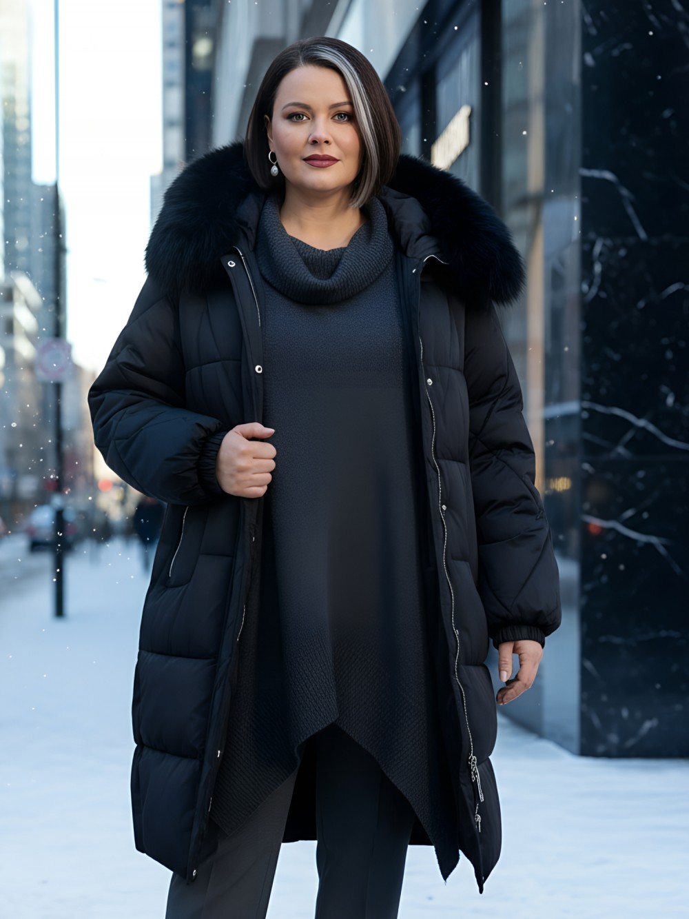 Четыре благородных оттенка коллекции осень-зима 2025 – глубокий черный, роскошный коричневый, изысканный светло-коричневый и стильный горчичный – великолепно сочетаются с натуральным мехом песца. Удлиненный силуэт до колена и свободный крой идеальны для размеров 46-54.