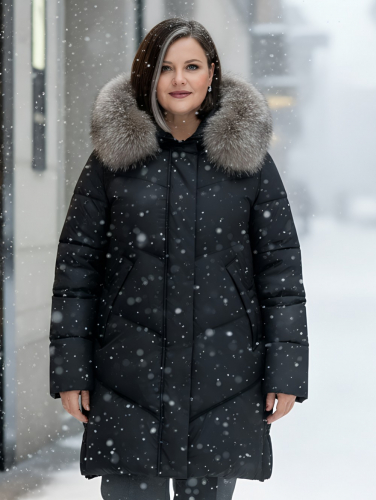 Четыре благородных оттенка коллекции осень-зима 2025 – глубокий черный, роскошный коричневый, изысканный светло-коричневый и благородный темно-зеленый – гармонично сочетаются с натуральным мехом песца. Удлиненный силуэт до колена и свободный крой идеально подходят для размеров 48-56.