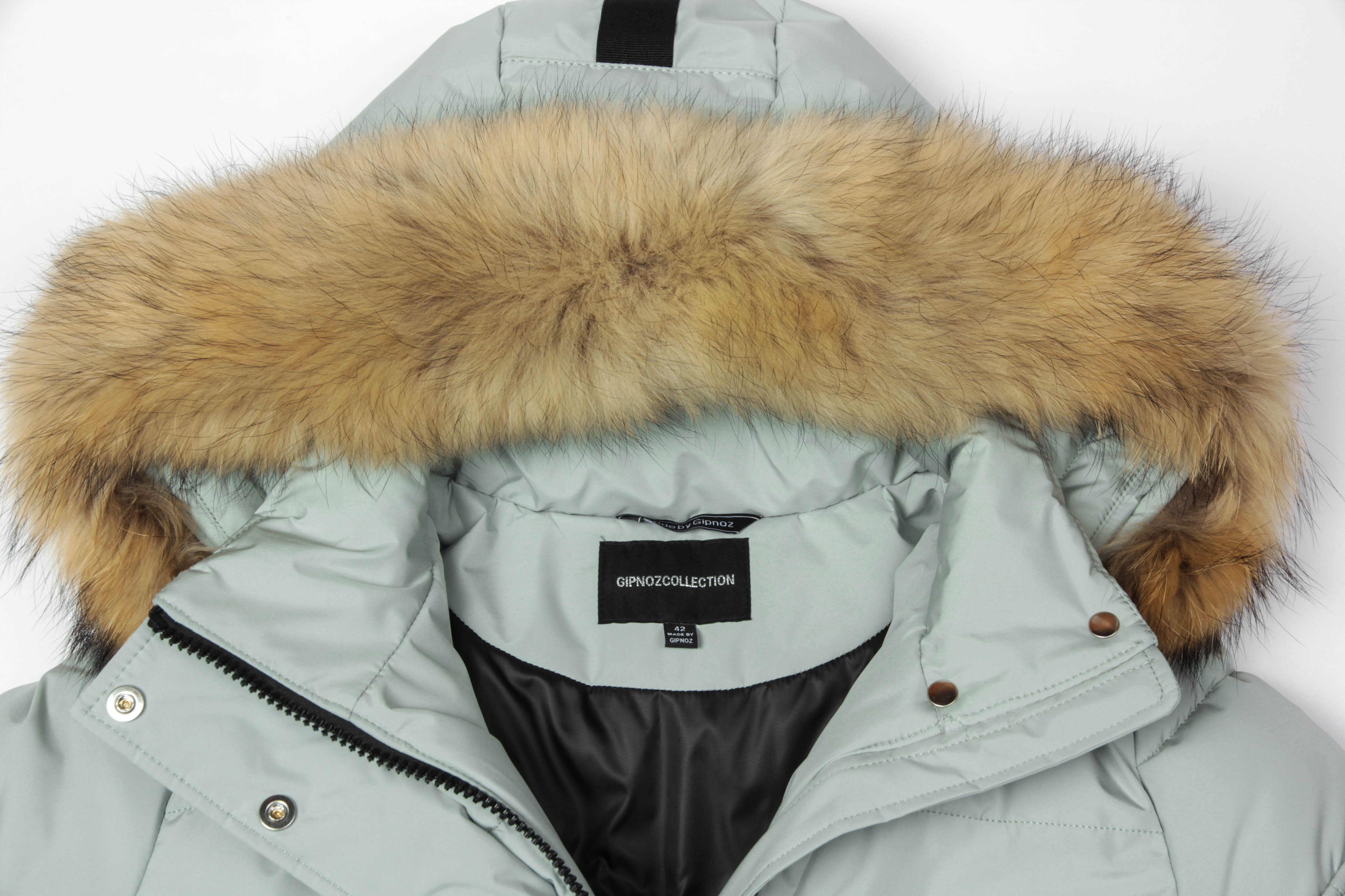 карман на подкладке изделия. Капюшон и мех отстегиваются. Мех – натуральный енот,