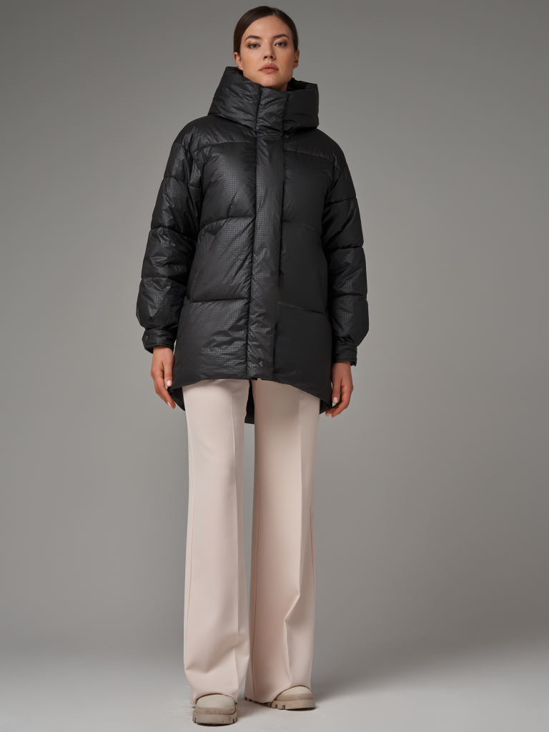 Пуховик oversize силуэта. В изделии есть внутренняя утяжка по низу. Рукав со спущенным плечом. По низу рукавов заложены складки и имеются манжеты с отделочными кнопками. Застежка на молнию, скрытую под планкой на потайных кнопках. В изделии имеются два функциональных кармана с листочками на магнитах и один внутренний карман. Ткань - плащевая с водоотталкивающей пропиткой. Утепление - Био-пух, 200 гр. Рекомендуемый температурный режим (от 0°C до -15°C). Длина изделия - 85 см. Длина рукава - 64 см.