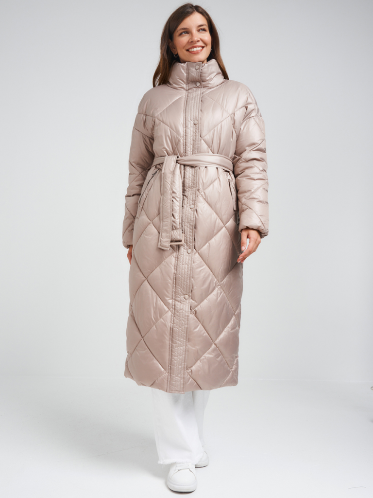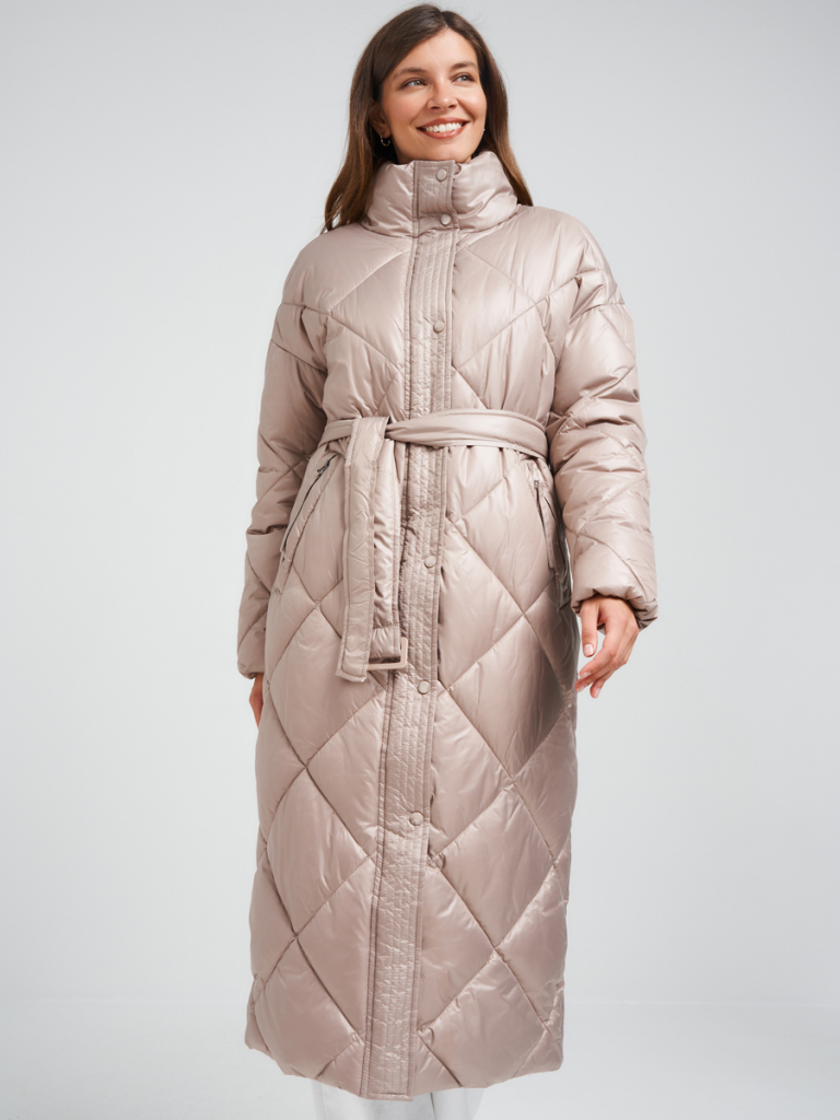 Пуховик прямого силуэта со стойкой на молнии и декоративных кнопках. В изделии два удобных кармана на молниях, а также есть внутренний карман. В комплекте с изделием идет пояс из основной ткани с пряжкой. Ткань - плащевая с водоотталкивающей пропиткой. Утепление – Био-пух, 260 гр. Рекомендуемый температурный режим (от -0°C до -20°C). Длина изделия - 120 см. Длина рукава - 65 см.