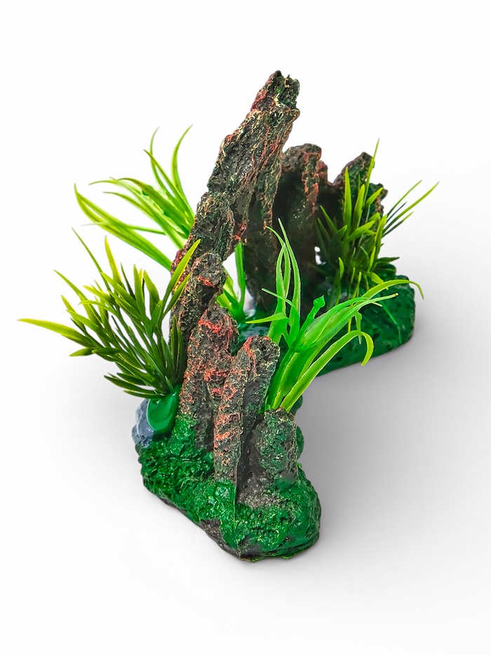* Натуральная эстетика: декорация воспроизводит структуру пористых камней, покрытых мхом. Зеленый оттенок создает иллюзию старого, заросшего водорослями утеса, гармонично сочетаясь с живыми растениями и темным грунтом.