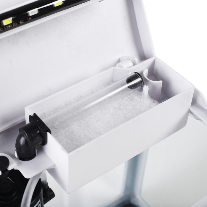 Полезный объем аквариума составляет 3.5 литра. Аквариум полностью готов к работе. Фильтр и светодиодная лампа встроены в крышку аквариума.