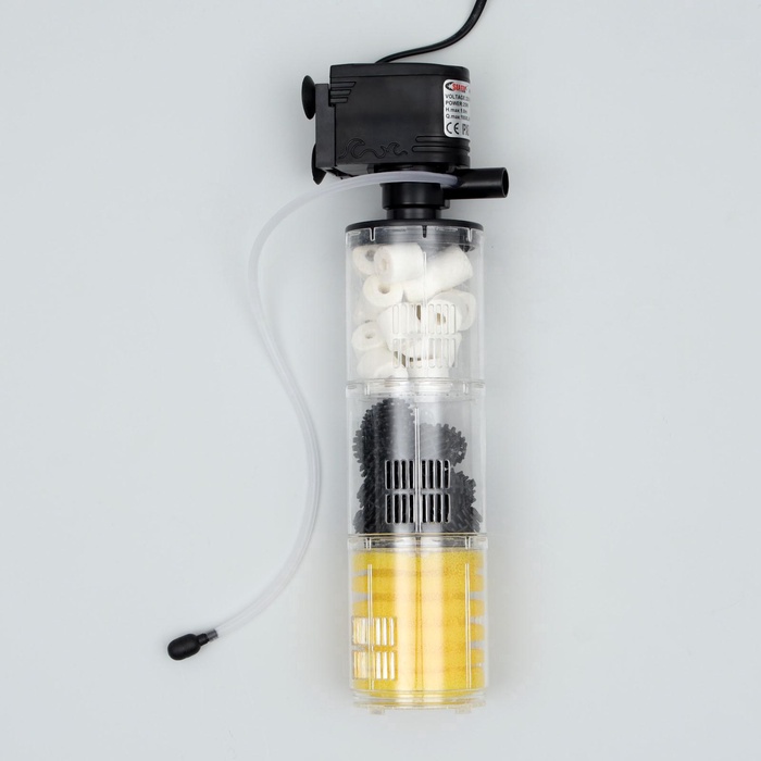 Он оснащен тремя секциями для очистки воды: губкой, биошариками и керамическими кольцами.