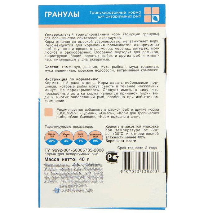 Корм для рыб и рептилий ЗООМИР «Гранулы» тонущие гранулы, коробка, 40 г