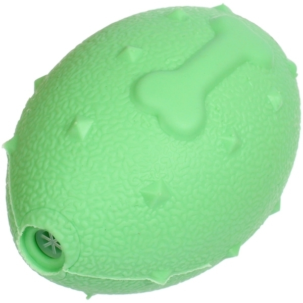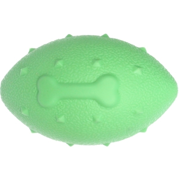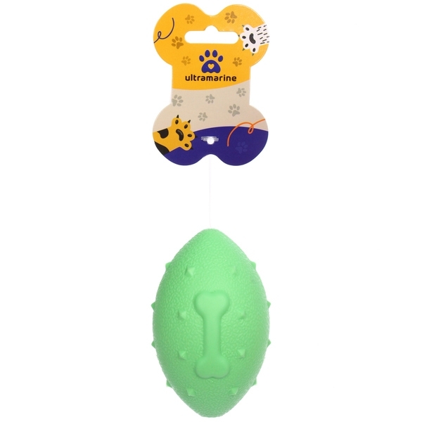 Мяч-регби выполнен из безопасного термопластичного полиуретана. При дальнем броске мячик, за счёт своей уникальной формы, может немного изменять траекторию полёта, добавляя азарта в игру. Мячик имеет яркий зелёный цвет, что делает его заметным для питомца. Плавает в воде, а значит это отличная игрушка для летних игр у водоема. Материал мяча при прокусывании не травмирует десна питомца. Легко моется проточной водой.