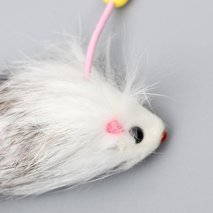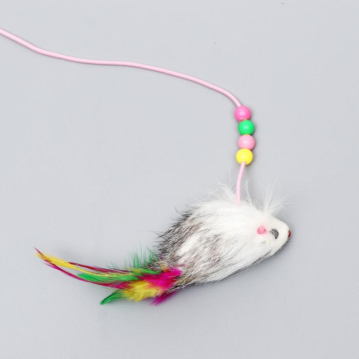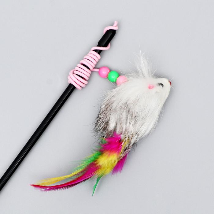 Дразнилка-удочка с мышью из натурального меха с перьями, микс цветов