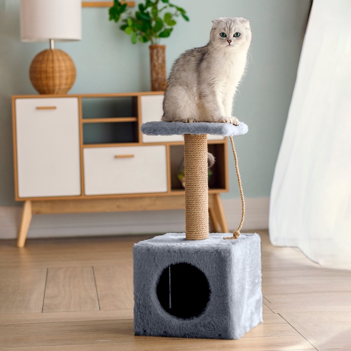 Домик для животных с когтеточкой, 32×32×64 см, с полкой, джут, серый