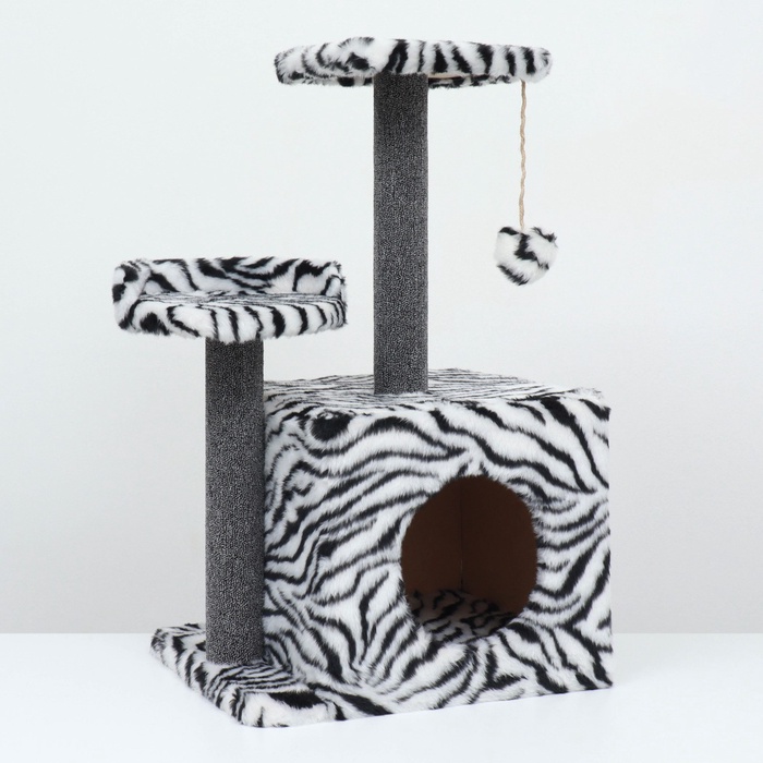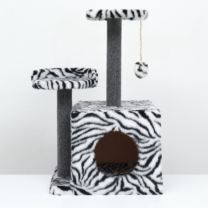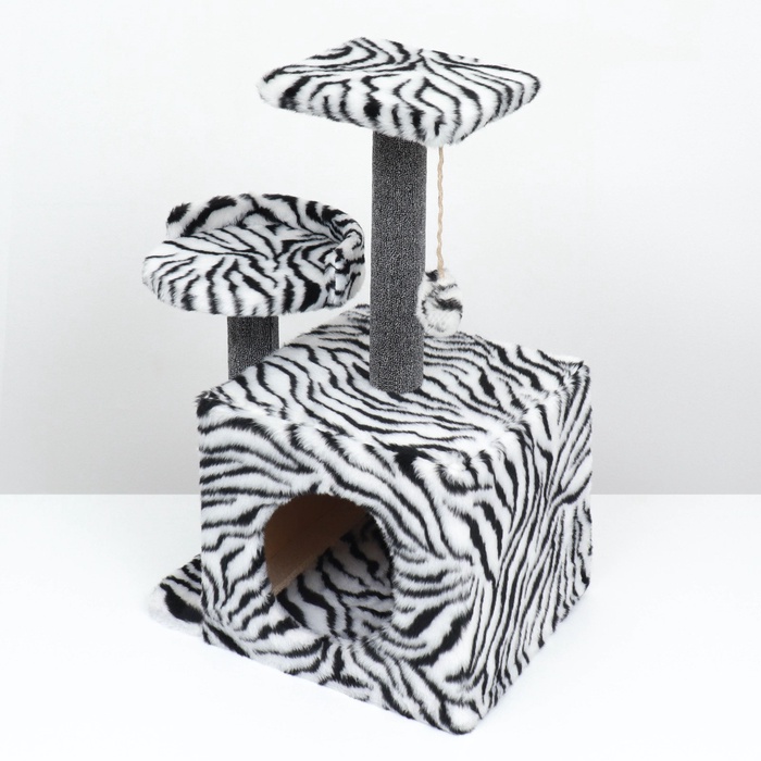 Домик выполнен из прочного материала — ковролина с узором зебра, который не только устойчив к царапинам, но и прекрасно вписывается в любой интерьер. Высота комплекса составляет 75 см, что идеально подходит для кошек любого размера. В нем есть закрытая зона для сна, открытые платформы для наблюдения и игры, а также встроенные когтеточки, которые помогают вашему питомцу поддерживать когти в отличном состоянии.