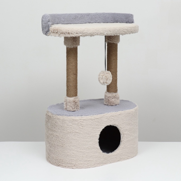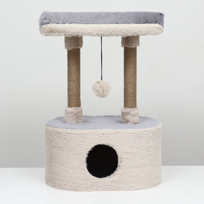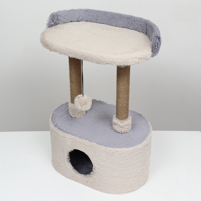 Домик для кошек с когтеточкой, 54×34×80 см, с овальной полкой, пушистый мех, джут, серый