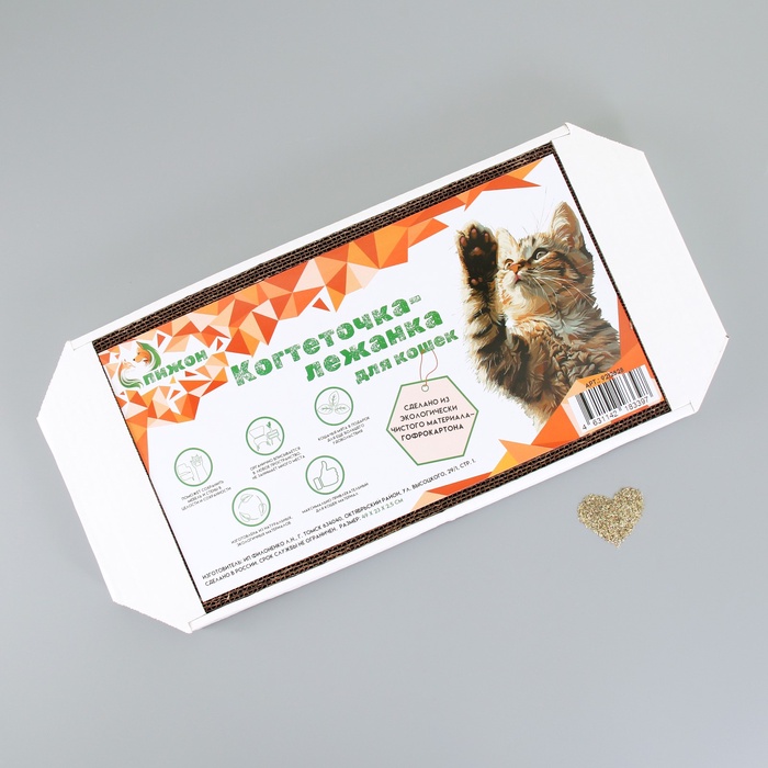 Он выполнен из гофрокартона, который изготовлен из природного материала - древесины и по своим свойствам очень на нее похож, чем и привлекают наших питомцев. Он достаточно плотен, чтобы выдержат острые коготки, и оптимально податлив, чтобы привлекать кошку.