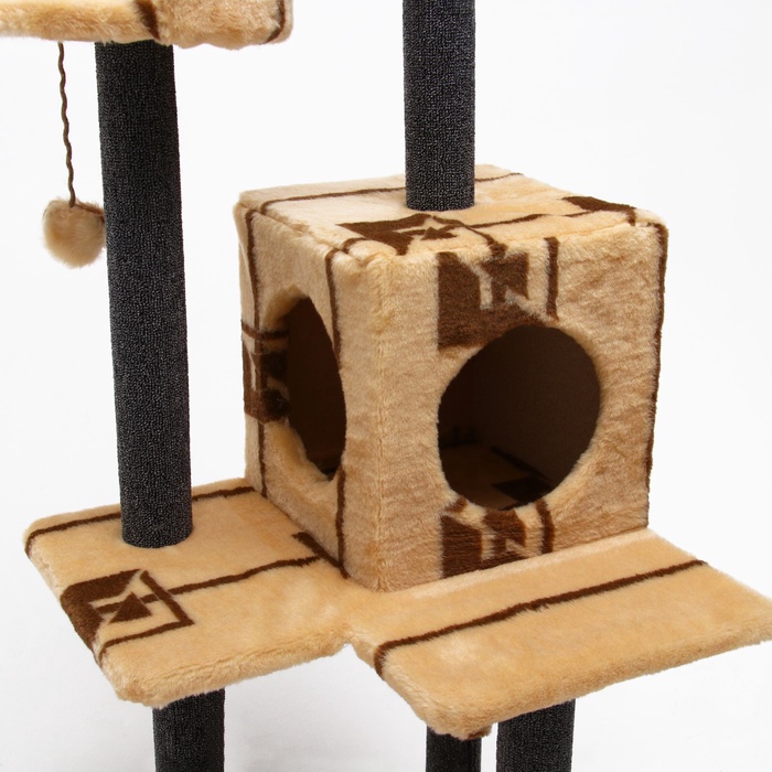 Прочный каркас, обтянутый мягким ковролином, гарантирует долговечность и устойчивость к когтям, а джутовые столбики с когтеточкой помогут сохранить мебель в первозданном виде. Закрытый домик на нижнем уровне создаст уютное убежище, где кошка сможет спрятаться от суеты, а удобные площадки на разных уровнях обеспечат идеальное место для игр и наблюдения.
