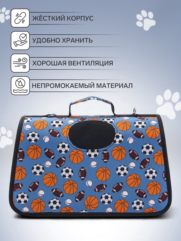 Комфортная переноска спортивного стиля с оптимальными размерами для средних питомцев. Голубой дизайн с разноцветными элементами добавляет практичности и стильности.