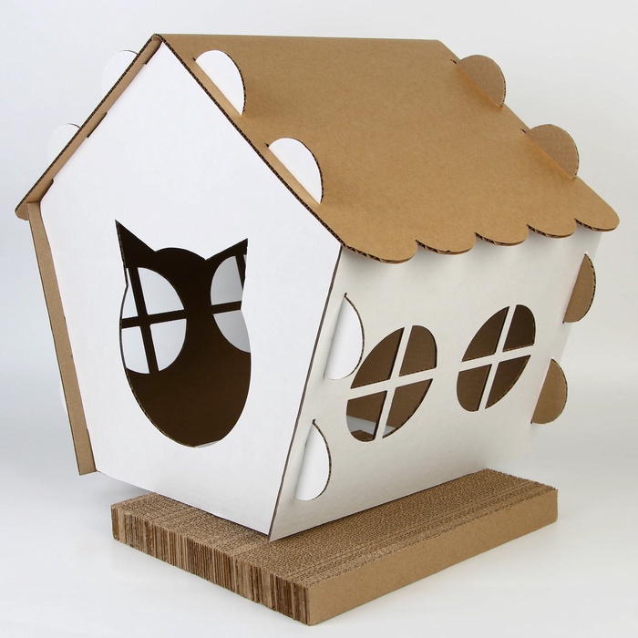 Изделие совмещает когтеточку и домик-лежанку. Подойдёт для мелких и средних пород котов и кошек. Котята также с удовольствием будут играть с аксессуаром.