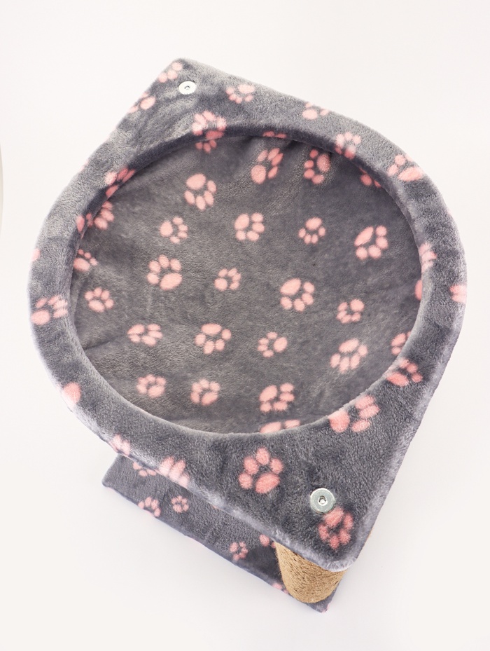 * Два уровня для отдыха: Наверху расположена мягкая лежанка, а между столбиками натянут уютный серый гамак. У кошки есть выбор, где устроиться: на высоте, наблюдая за происходящим в комнате, или внизу, в более защищенном коконе.
