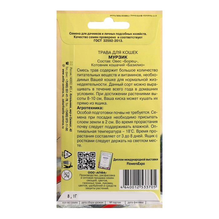 Семена Трава для кошек «Мурзик», смесь, 8.1 г, «АЭЛИТА экстра»