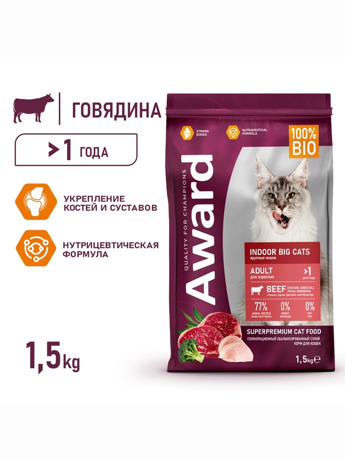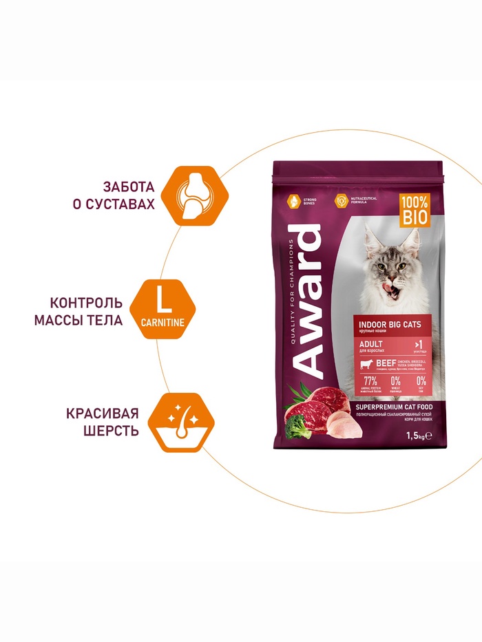 Сухой корм AWARD Indoor Big cats для взрослых домашних кошек крупных пород, говядина, курица, 1.5 кг