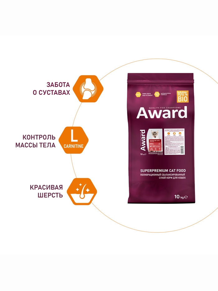 Сухой корм AWARD Indoor Big cats для взрослых домашних кошек крупных пород, говядина, курица, 10 кг