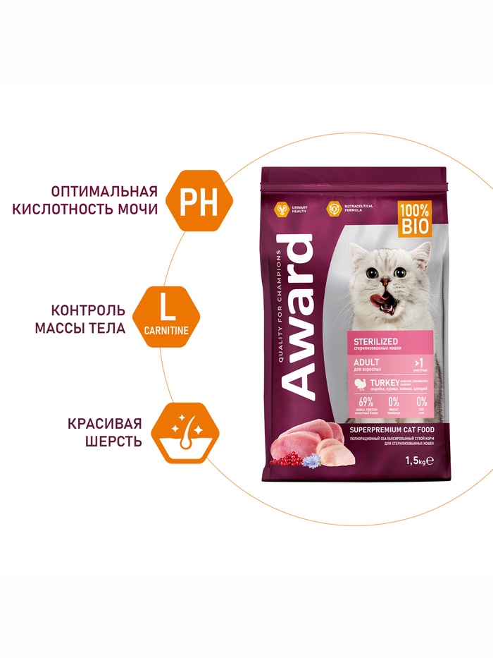 Сухой корм AWARD Sterilized для вз-х стерил. кошек с инд/кур. (клюква и цикорий) 1.5 кг