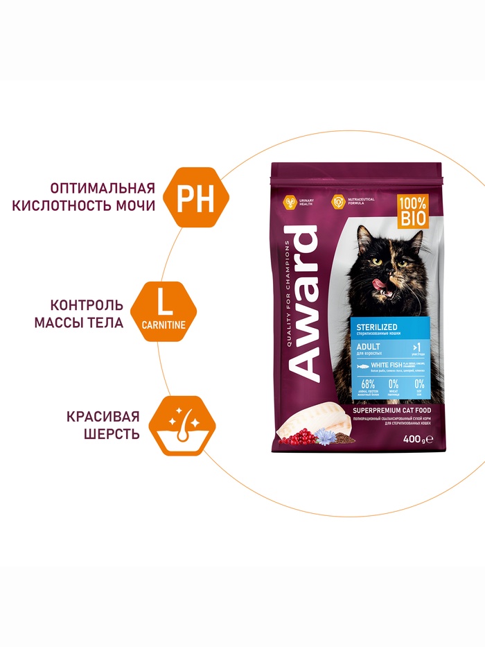 Сухой корм AWARD Sterilized для взрослых стерилизованных кошек с белой рыбой (лён, клюква, цикорий) 400 г