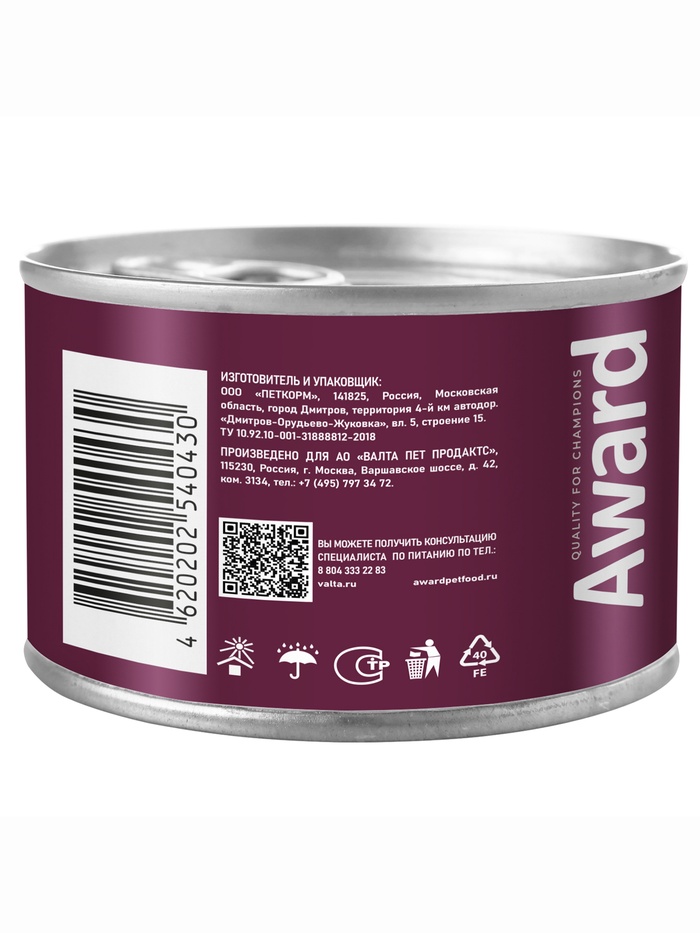 Влажный корм AWARD для котят до 4 мес, бер/корм-их кошек паштет из инд 200 г