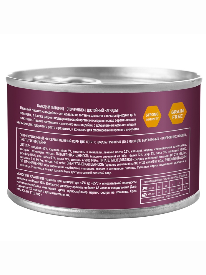 Для кого: котят с 4 недель жизни, беременных и кормящих кошек. Паштет из индейки помогает мягко перейти от молока к полноценному рациону и поддерживает организм на этапе роста и восстановления.