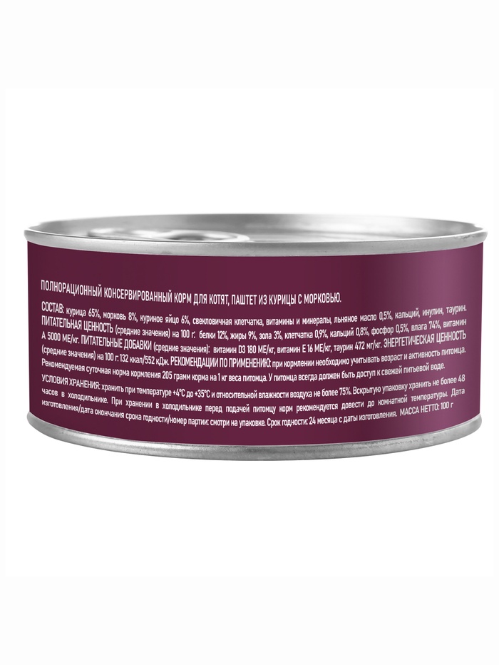 Ключевые запросы: паштет для котят с курицей, влажный корм для котят до 1 года, корм с морковью для котёнка, прикорм для котят 100 г, паштет для раннего возраста, корм для малышей в банке.